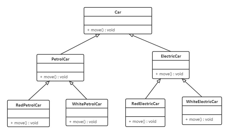 汽车按“动力源”划分可分为汽油汽车、电动汽车等;按“颜色”划分可分为白色汽车、黑色汽车和红色汽车等。如果同时考虑这两种分类,其组合就很多。类图如下:  从上面类图我们可以看到使用继承复用产生了很多子类,如果现在又有新的动力源或者新的颜色的话,就需要再定义新的类。我们试着将继承复用改为聚合复用看一下。  本篇博客来自于黑马程序员视频教程的总结以及笔记的整理,仅供学习交流,切勿用于商业用途,如有侵权,请联系博主删除,博主QQ:194760901