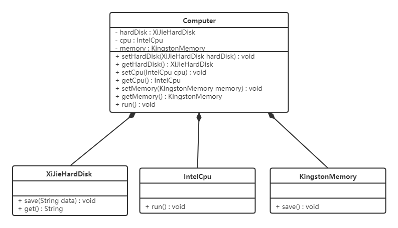 上面代码可以看到已经组装了一台电脑,但是似乎组装的电脑的cpu只能是Intel的,内存条只能是金士顿的,硬盘只能是希捷的,这对用户肯定是不友好的,用户有了机箱肯定是想按照自己的喜好,选择自己喜欢的配件。