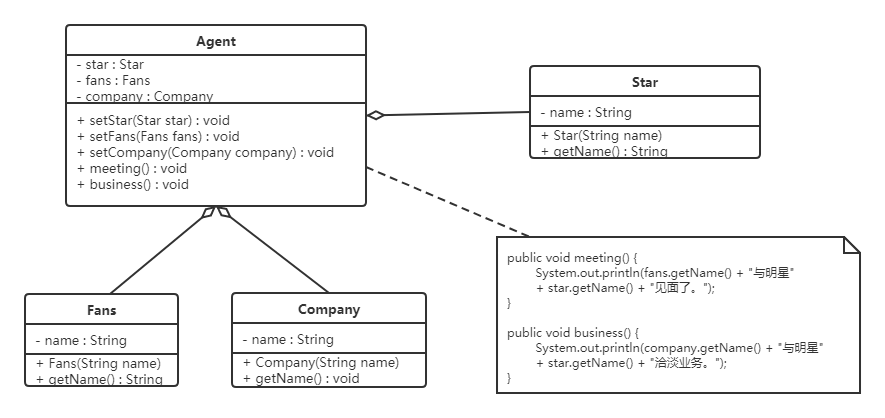 System.out.println(company.getName() + "与明星" + star.getName() + "洽淡业务。");