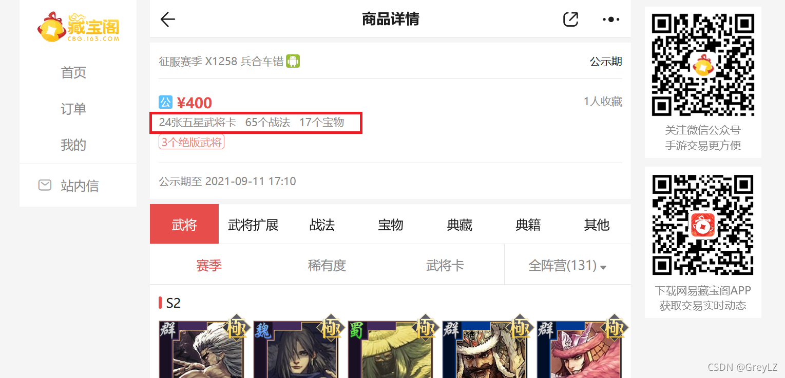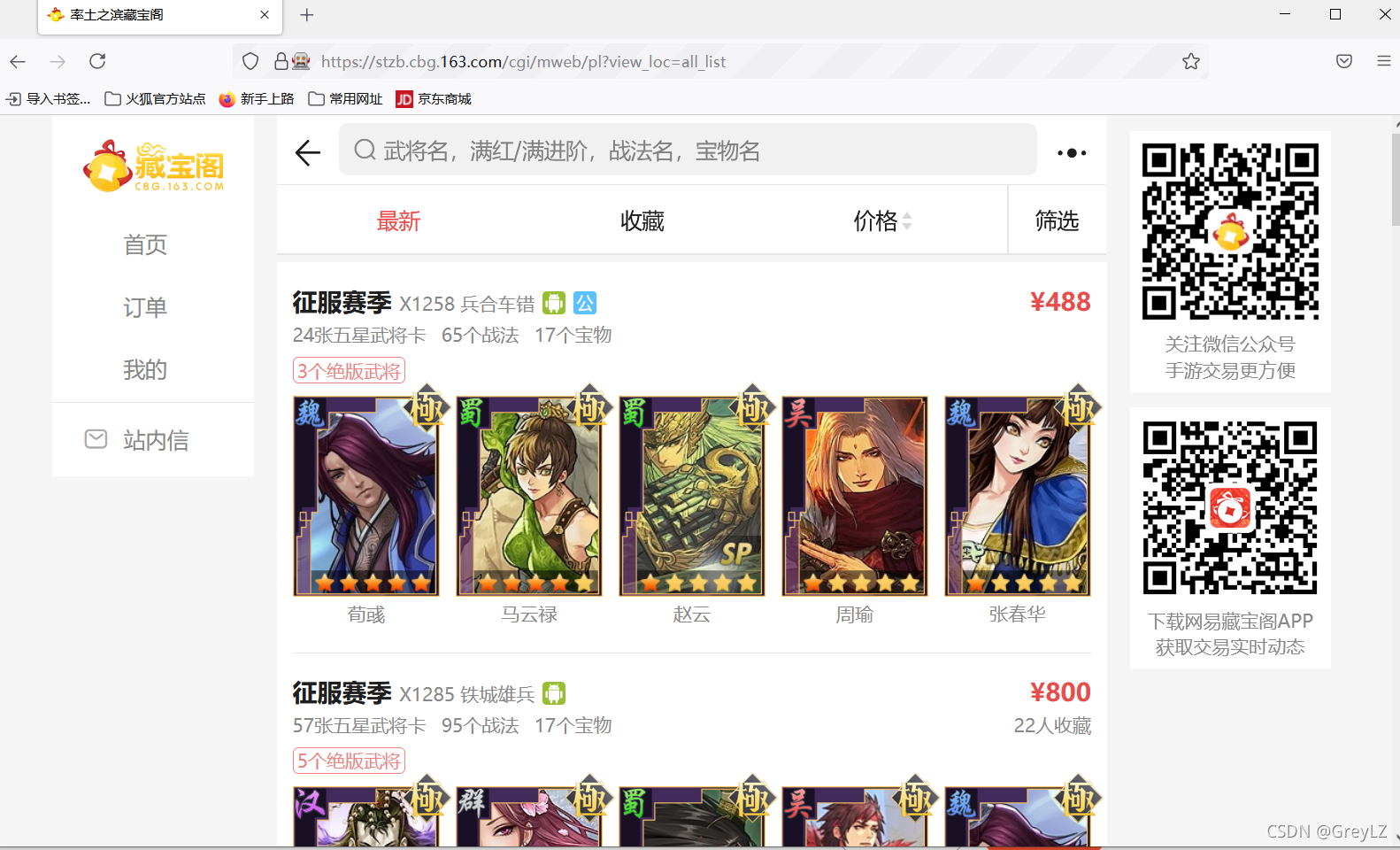 ????????本文演示如何使用Selenium爬取《率土之滨》藏宝阁账号信息(武将数量,武将姓名,战法数量,宝物数量,价格,收藏数量等等),因为不同的信息需要进行各种点击才能获取,因此需要使用动态网页自动化工具Selenium。本文仅供个人学习,不做商业用途。