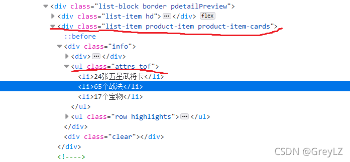 ?找到div标签 class=list-item product-item product-item-cards 以及 ul标签class=attrs tof就能定位到武将数量,战法数量,宝物数量的区域。
