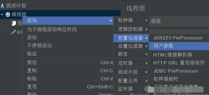 ①线程组,右键依次选择添加--》前置处理器--》用户参数。
