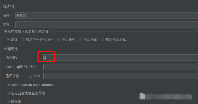 ④注意,因为设置了两组登录账号,所以,需要在线程组里设置线程数为2。?