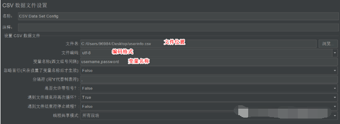 Sotp thread on EOF?:当读取到参数文件末尾时,是否停止读取线程,默认为 false。 ①若为 true,则在读取到参数文件行末尾时,终止参数文件读取线程。例如:线程组的线程数 * 线程组的循环次数 = 10,参数文件行数 = 7,那么将在第 8 次开始停止线程。 ②若为 false,此时线程会继续读取,但是会请求错误,因此时读取的数据为 EOF。以上同例,自第 8 次开始,线程的请求数据为 EOF。 -