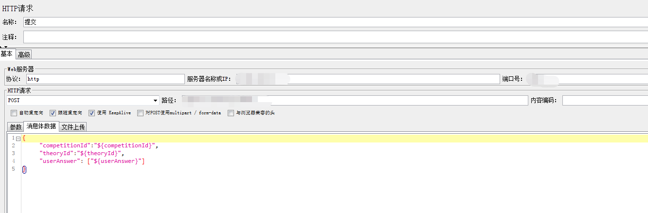 jmeter请求参数为数组今天压测的项目接口修改了,原来传入字符串,现在改成了数组,开始苦思冥想,想用前置处理器、后置处理器写几行代码完成。捣鼓了半天发现传过去的字符串没有双引号。 参数格式是: { a:“1”, b:“2”, c:[“3”,“4”] } 折腾了半天发现只需要使用json格式传入就好了,生无可恋.jpg 首先添加http请求,然后选择消息体数据,将json数据填好。这里使用了csv文件参数化。