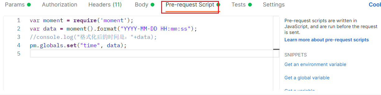 b.在Pre-request Script中获取当前时间,并设置为全局参数