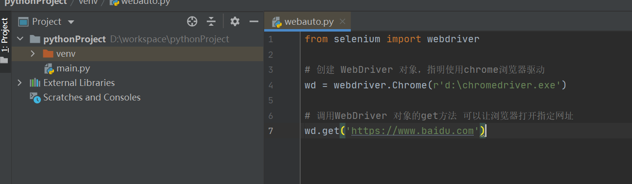 第四行的r是字符串的意思,见2.1的Selenium驱动在我的D盘根目录下。附上源码