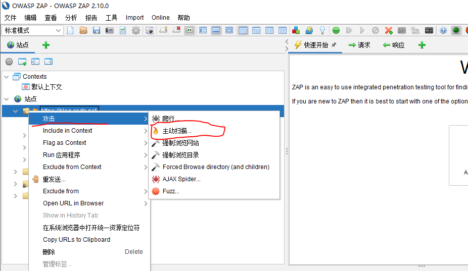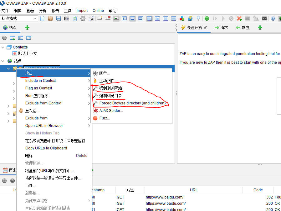 手动爬行网站后,选择该站点进行owsap zap的强制浏览网站、强制浏览目录、forced browse directory(and children),尽量的爬行出网站的所有链接页面!