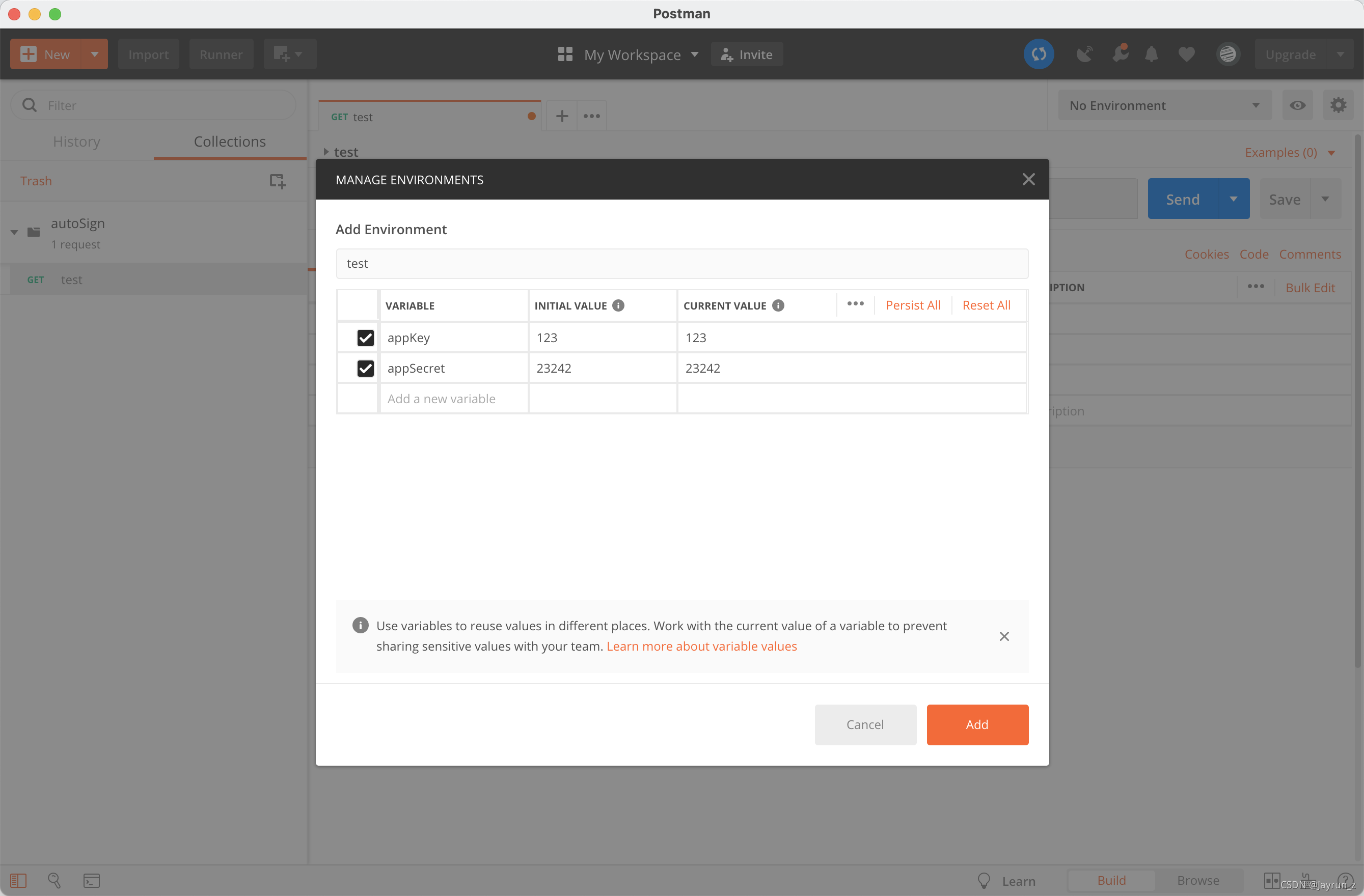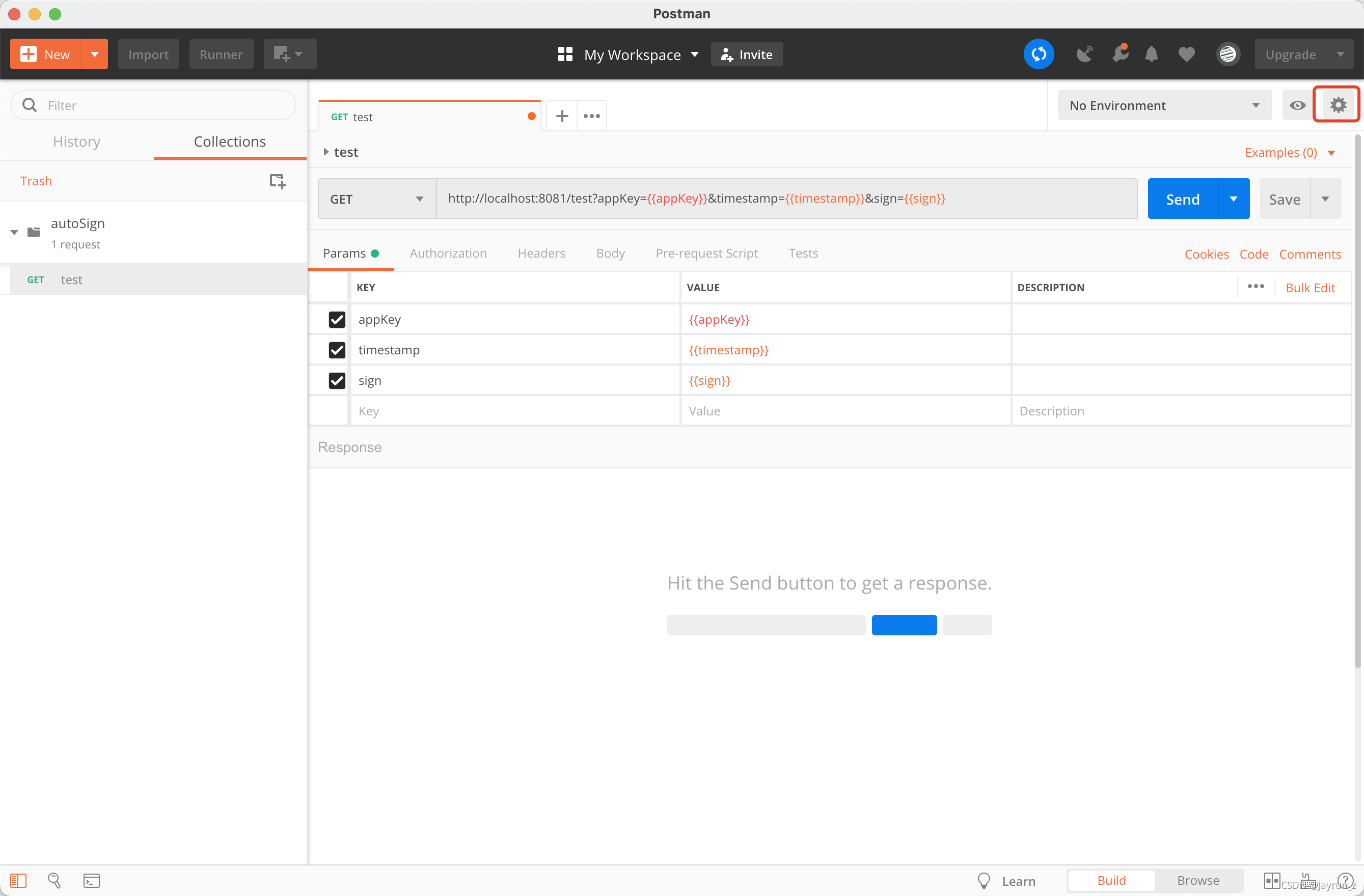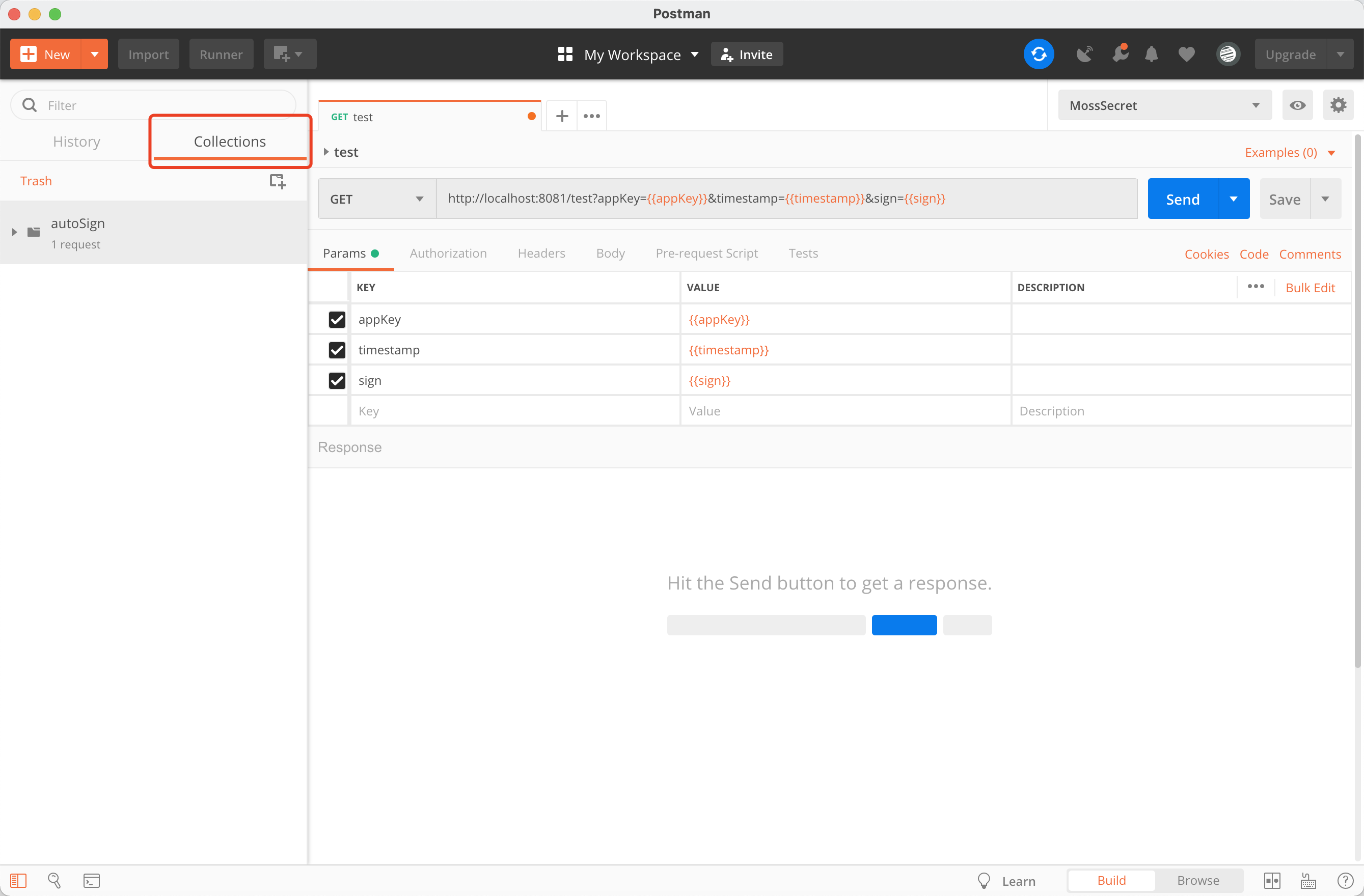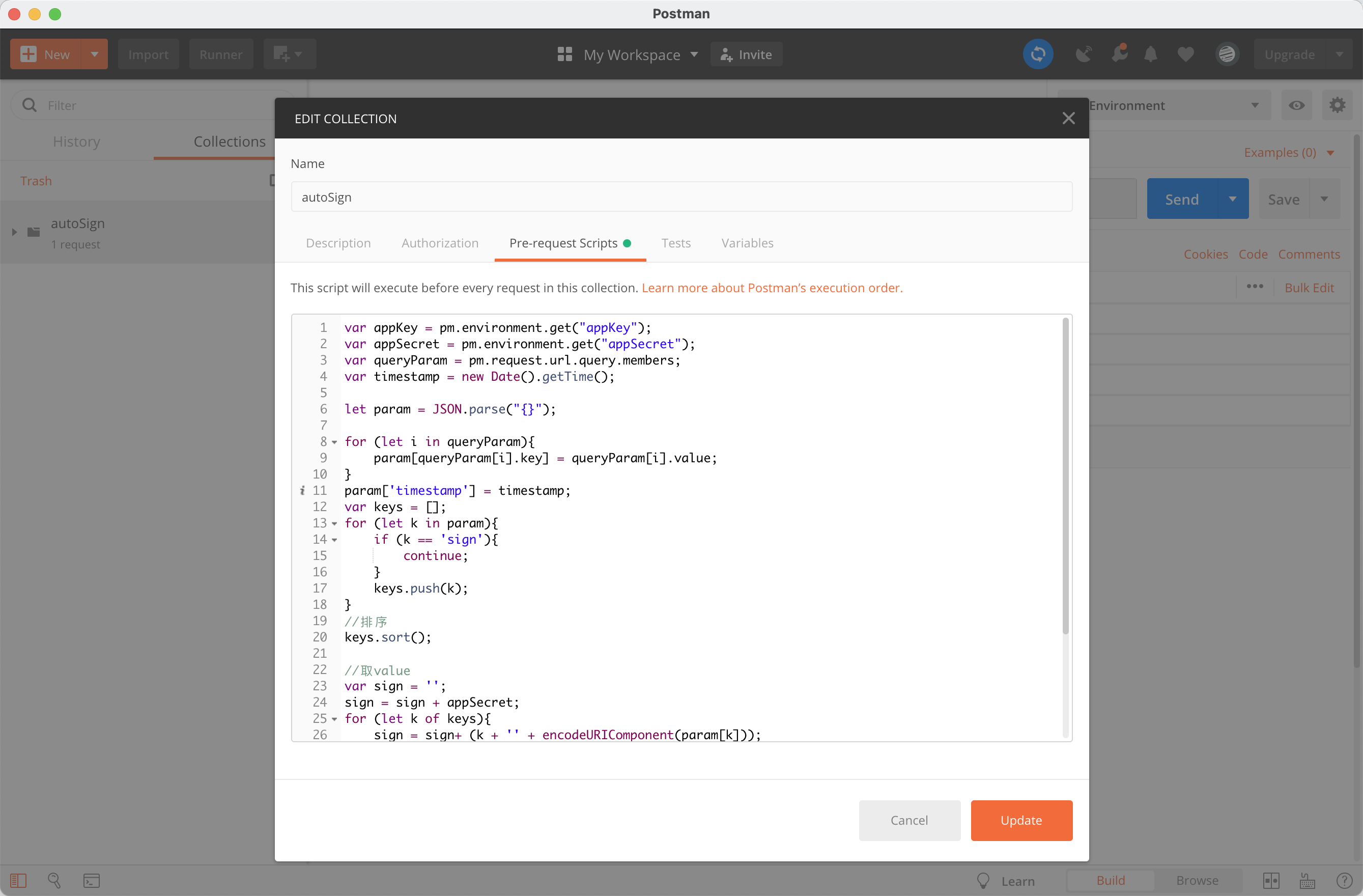 后端接口为了避免参数被篡改,有参数签名的校验,为方便使用postman测试接口,可在postman设置自动签名