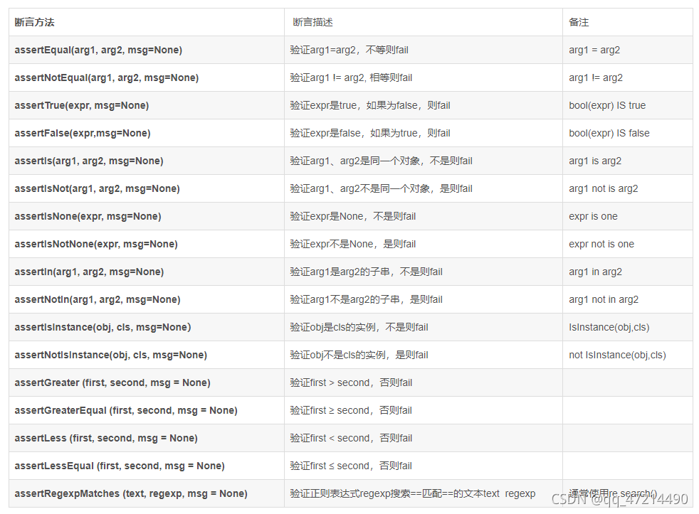 断言方法 python unintest单元测试框架提供了一整套内置的断言方法。 1、如果断言失败,则抛出一个AssertionError,并标识该测试为失败状态