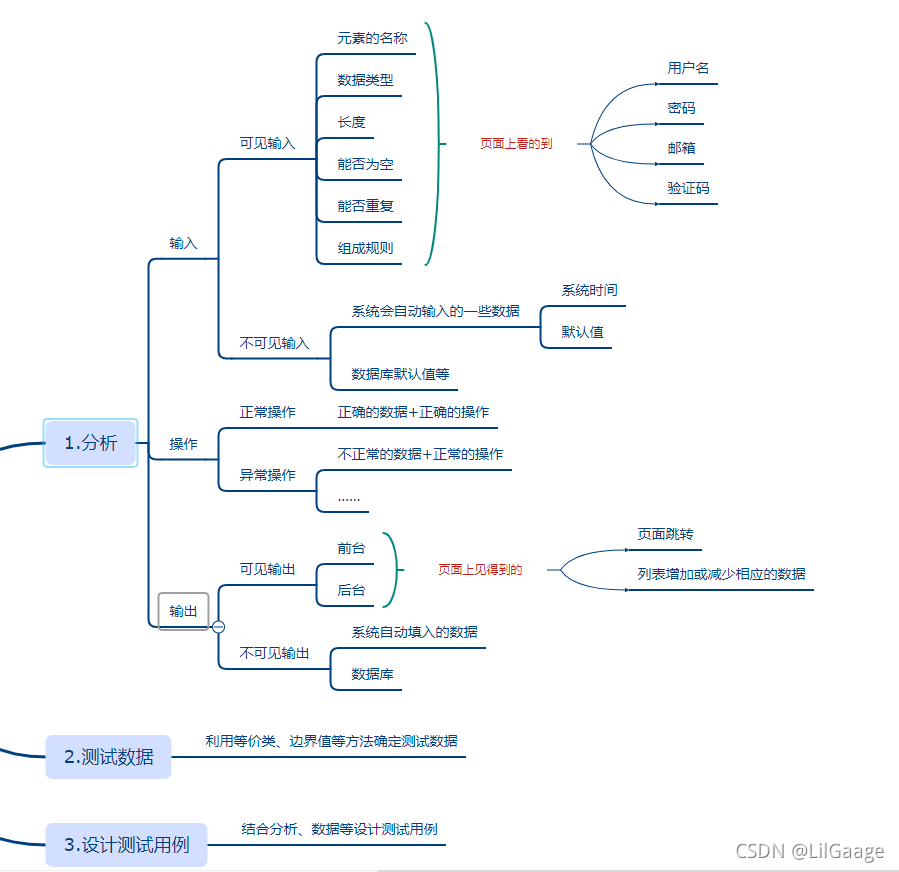 ????????(1)先考虑正向的测试用例------>验证功能能不能使用 ????????(2)然后从各个角度考虑逆向的测试用例------->验证用户输入错误的数据或者进行错误的操作时是否有正确的响应 ????????(3)如果有必填项和非必填项,重点关注必填项 ????????(4)有些功能不用正交法组合可能超级大(几百万种),用了正交法还是有几百种 ?? ?????????????????① 如果时间足够,就把产生的所有组合全部测一遍,再进行补充组合情况 ?????????????????? ?② 如果时间不够,就随机挑选其中几种组合进行测试 ?????????????????? ?③ 只要保证,每一个条目都被测到 ?? ?????????????????④ 因为每个分类都有筛选,找一个筛选条件少的所有组合都测一遍,然后找个筛选条件多的,随机测试几种组合 ????????(5)下拉列表:重点考虑第一个和最后一个(边界值) ????????(6)地址:行政区域的所属情况,考虑特殊情况(香港-九龙,台湾-台北) ????????(7)用例标题:*****情况下验证***的功能,****时做***** ?????????????????? ?eg: ?①密码不正确时进行登录 ?? ? ????????????????? ? ? ② 手机号格式错误时验证添加会员功能正确性