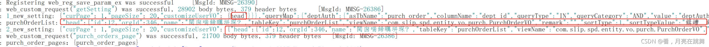 ?? ? web_reg_save_param_ex( ?? ??? ?"ParamName=purchOrderList", // 修改参数名,便于记忆 ?? ??? ?"LB=\"data\":{", // 修改 token 值解析算法 ?? ??? ?"RB=\"}}", ?? ??? ?SEARCH_FILTERS, ?? ??? ?"Scope=Body", ?? ??? ?"RequestUrl=*/api/customize/user/getSetting?tableKey=purchOrderList-com.slip.spd.entity.vo.purch.PurchOrderVO*", ?? ??? ?LAST);