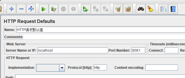 2、创建HTTP请求默认值,在之后所有创建的HTTP请求中都会先经过HTTP请求默认值,可以设置默认访问地址和端口号,如下图所示:
