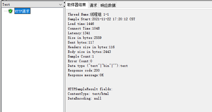 右键线程组>添加>取样器>HTTP请求 我们拿百度当例子:  添加一个结果树,方便查看请求的发送数据和响应数据  点击运行,在结果树里可以看到请求数据和响应数据。