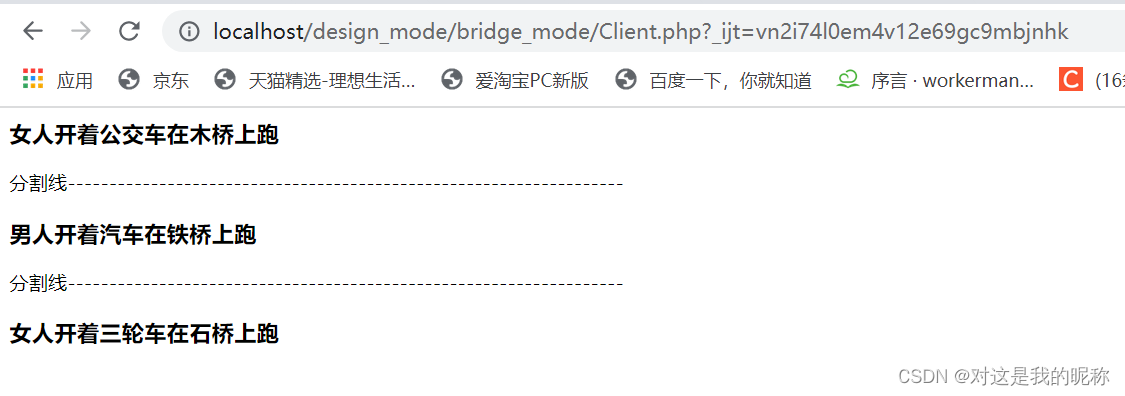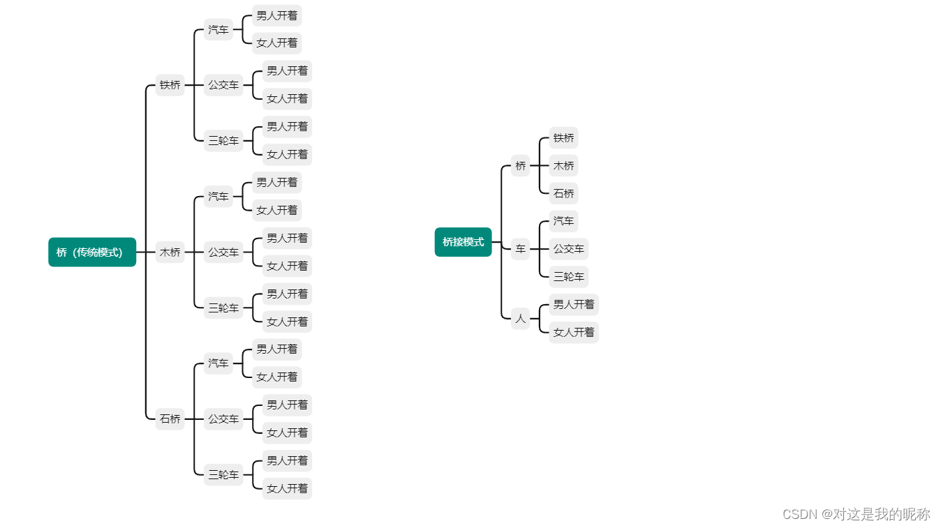 人开着车在桥上跑,人可以是男人、女人,车可以是公交车、汽车、三轮车,桥可以是铁桥、木桥、石桥。传统模式的写法就是人继承车,车继承桥,但是由于这三个维度都有多种变化,如果用继承来写,势必会造成类的爆炸。