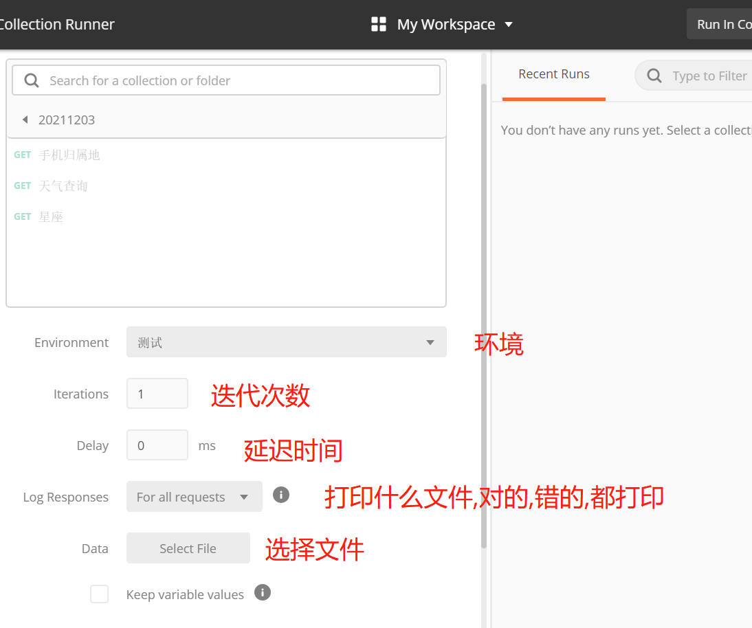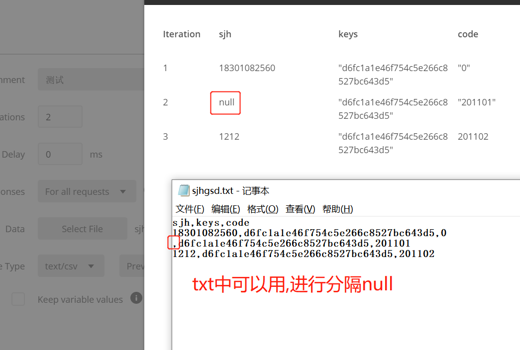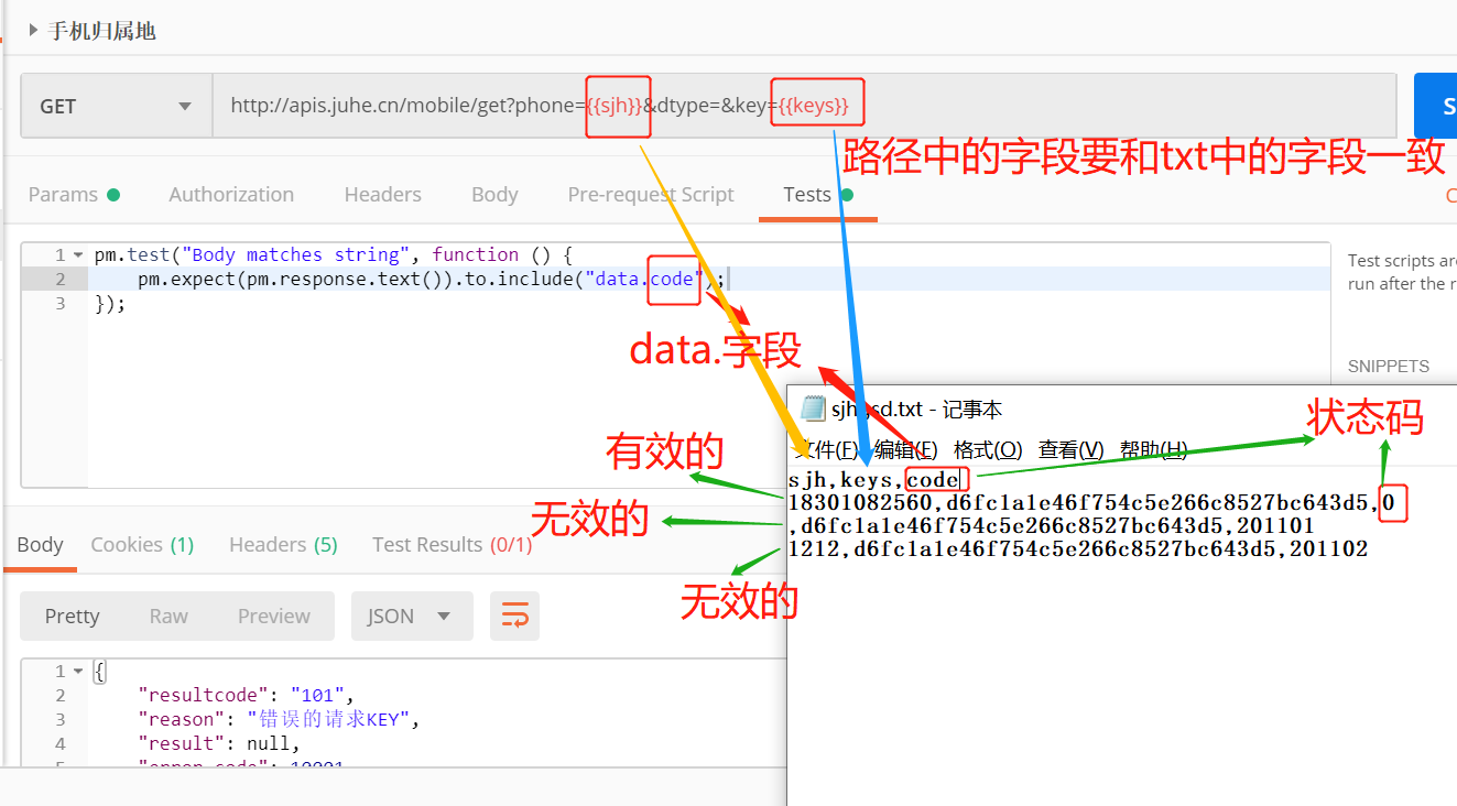 {{$guid}}:生成随机的guid字符串 用例的批量执行:  数据驱动: 将测试数据保存本地,一次性运行; 在参数里面的数据文件值和取全局变量一致,使用{{}},在断言里面取数据文件的值使用:data.字段名。