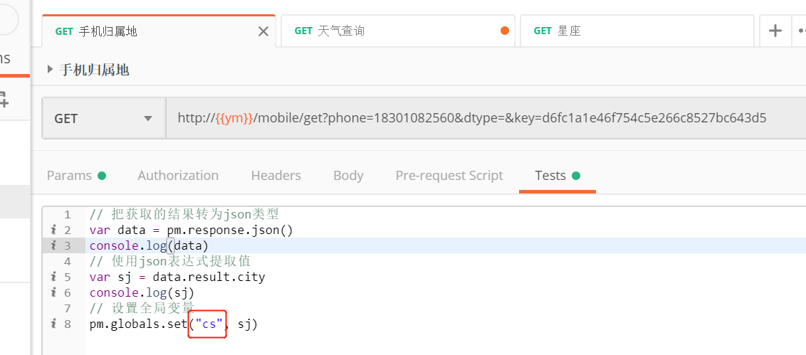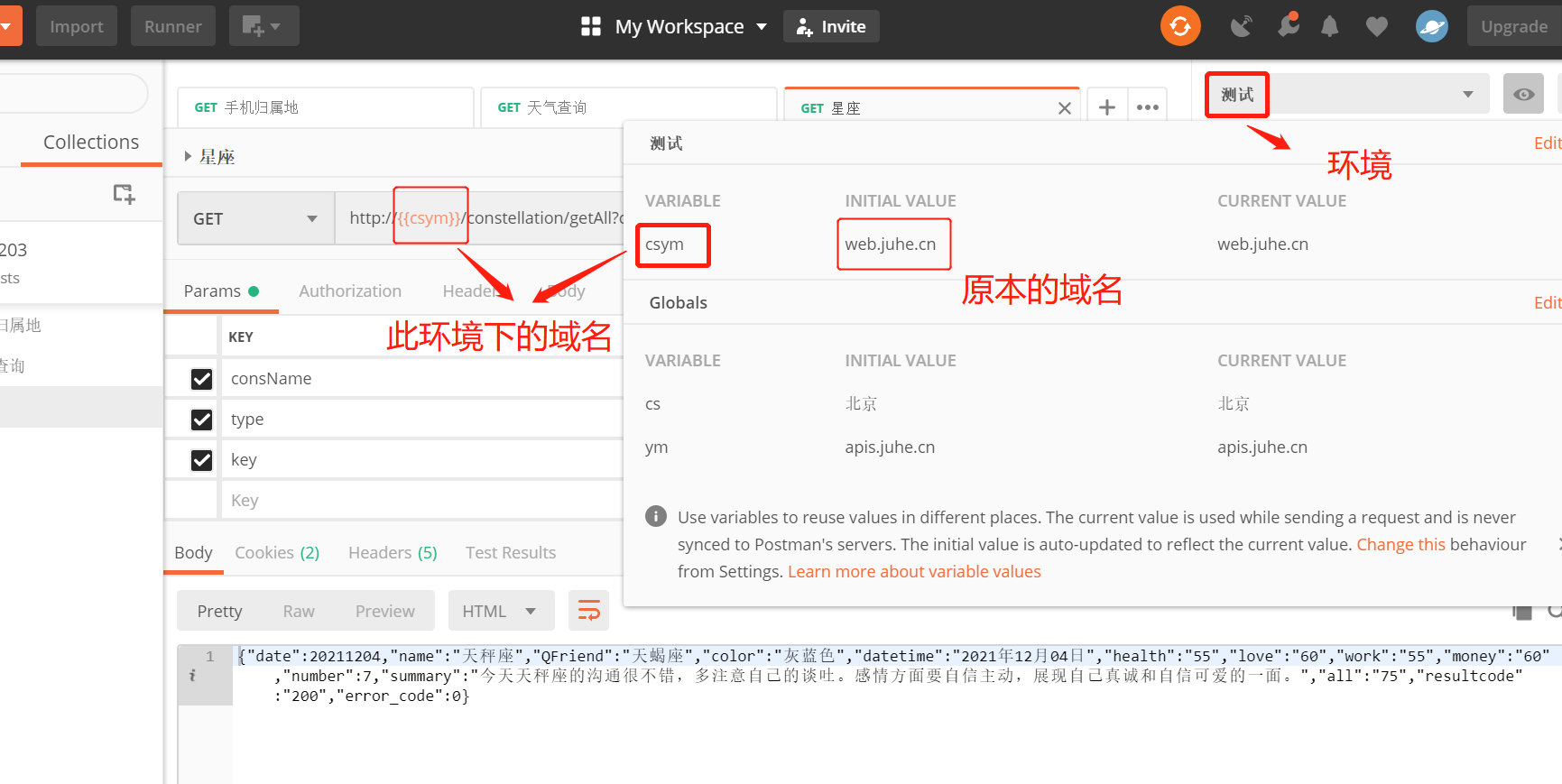 postman日常操作: **全局变量:**把共同使用的变量放到全局变量中,调用时只需要用{{变量名}}即可,适用于所有的接口。