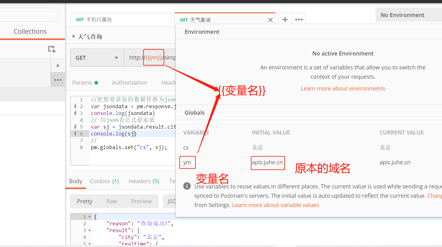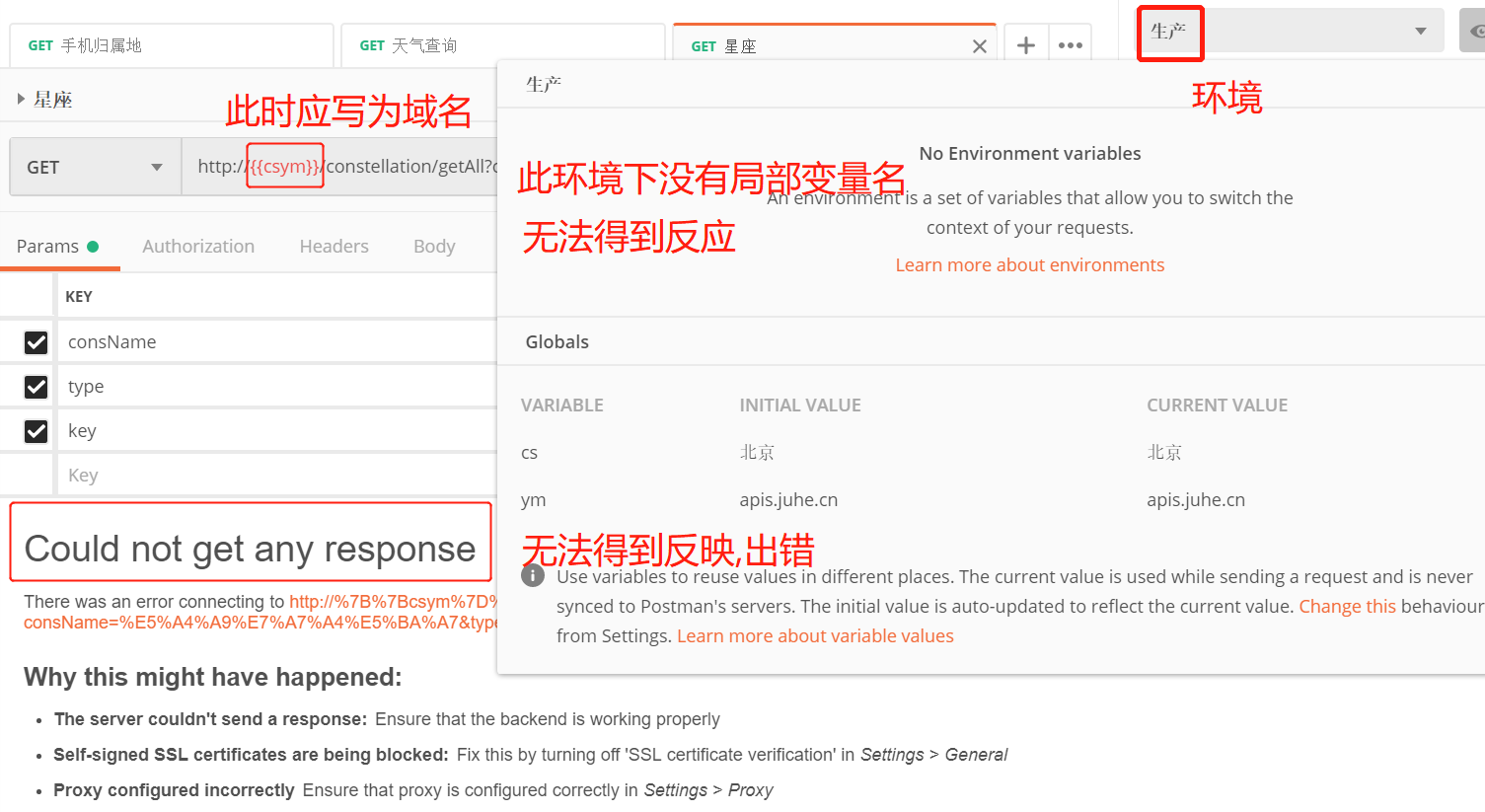 环境变量的使用: 公司中至少有是三个环境:开发环境,测试环境,验收环境; postman中可以演示不同的环境; 设置环境变量: 环境变量只适用于自己的环境,其他环境不适用:  错误环境下的环境变量使用: