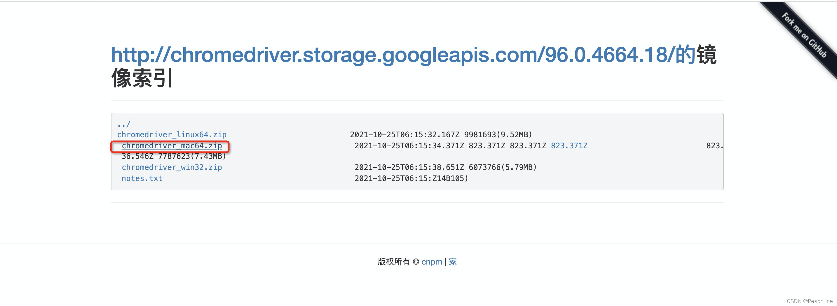 2、根据版本号,去ChromeDriver中下载对应的版本http://npm.taobao.org/mirrors/chromedriver/可能没有一模一样的小版本,找一个大版本相同的就可