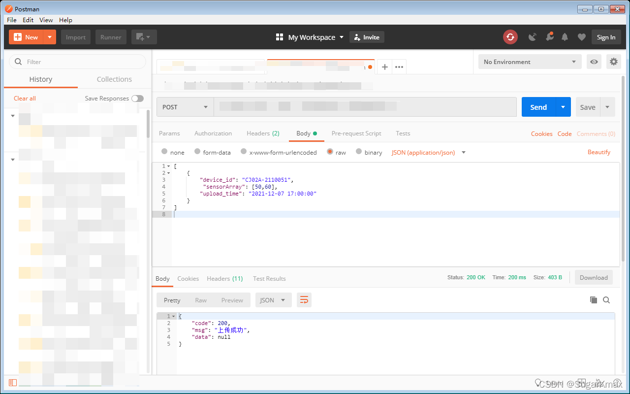 ? ? ? ? 由于项目要求向服务器平台提供的api接口发送特定格式的json数据,本地客户端处理后向其发送,首先是用postman模拟了一下上传的效果,以及查看返回的状态码判断上传是否成功。
