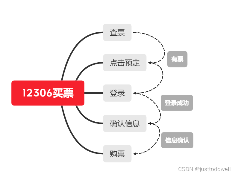 在书写程序之前,我们应该要先来了解一下我们在12306买票的时候需要进行什么样的流程,我们对车票进行查询后,如果有票,那么我们就进行登录,登录成功后就进行买票了。大概的流程图如下: