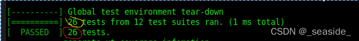 Gtest提供的正确率:Gtest运行完测试用例后,打印的最后一节里面,有两个数,红色圈的除以黄色圈的就是通过率,下图通过率是100%