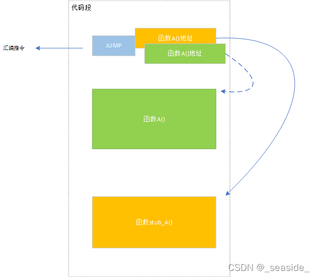? ? ? ? 程序便后load到内存里面,这些汇编指令全都在代码段,按照编译器的规则排布好的。对于函数跳转一版都是jump指令+函数地址。我们找到这条指令,然后把jump指令后的函数地址换成桩函数地址,然后程序执行的时候就可以跳转到装函数了,见下图本来要跳转到绿色区域,但是替换函数地址后就会跳转到黄色区域了,这是最基本的原理