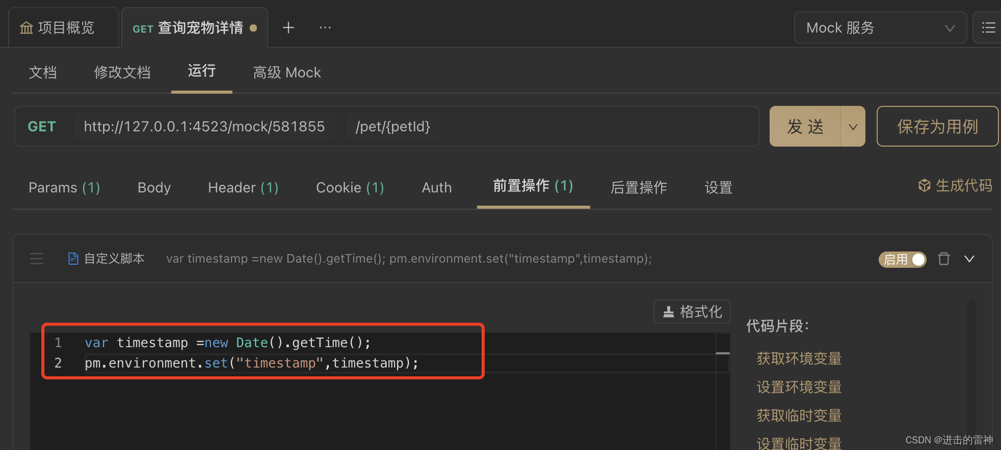 将参数 timestamp 的值设置为 {{timestamp}} 。当请求发送时,前置脚本将被执行,环境变量 timestamp 的值会被设置为当前时间戳,同时 {{timestamp}}也会被替换为当前时间戳。