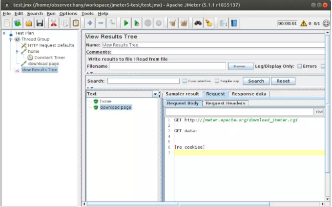 按照默认线程组配置,脚本执行一次即结束。点击 View Results Tree,可看到请求执行详细信息,包括请求头,请求体,响应头和完整的响应体等信息。 三.场景编排 1.真实压测场景不会只有一个请求,而是多个请求按一定顺序和规则的编排组合,即场景编排。场景编排是 JMeter 等压测引擎最重要的功能之一,也是与 Apache ab 等简单压测工具的重要区别之一。 2.这里我们假设一个最简单的场景,先访问 JMeter 主页,停留 1 秒钟后跳转到下载页。 3.一个脚本访问一个网站的不同页面(Path)时,可添加一个 HTTP Request Defaults 节点,配置默认协议类型和服务器名。这样可避免重复配置,需要修改协议类型(如 https 与 http 切换)或压测域名时,只用修改 HTTP Request Defaults 即可。
