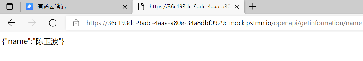 ? 7、此时若在浏览器等工具,请求模拟的接口(url+地址),即可返回模拟正文信息,如: (1)浏览器请求mock接口 https://36c193dc-9adc-4aaa-a80e-34a8dbf0929c.mock.pstmn.io/openapi/getinformation/name