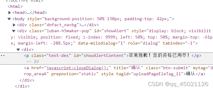 我仔细对比了一下dnf网页以及作为例子的网页,发现这两者的弹窗是有差别的,dnf的弹窗存在时,我还可以对网页进行下拉等操作,但是简单例子的弹窗存在时,我只能先关闭弹窗再对网页进行操作。 排除了alert的问题,绕了一圈,我又绕回来了。因为弹窗的提示信息是在执行了js之后才出现的,而弹窗提示下的‘确认’二字是一直存在的,于是我尝试修改xpath去提取,一开始想着节省时间,注释掉了中间登陆的代码, 直接去提取确认,发现没提取出来。然后取消注释之后又能提取出来了。