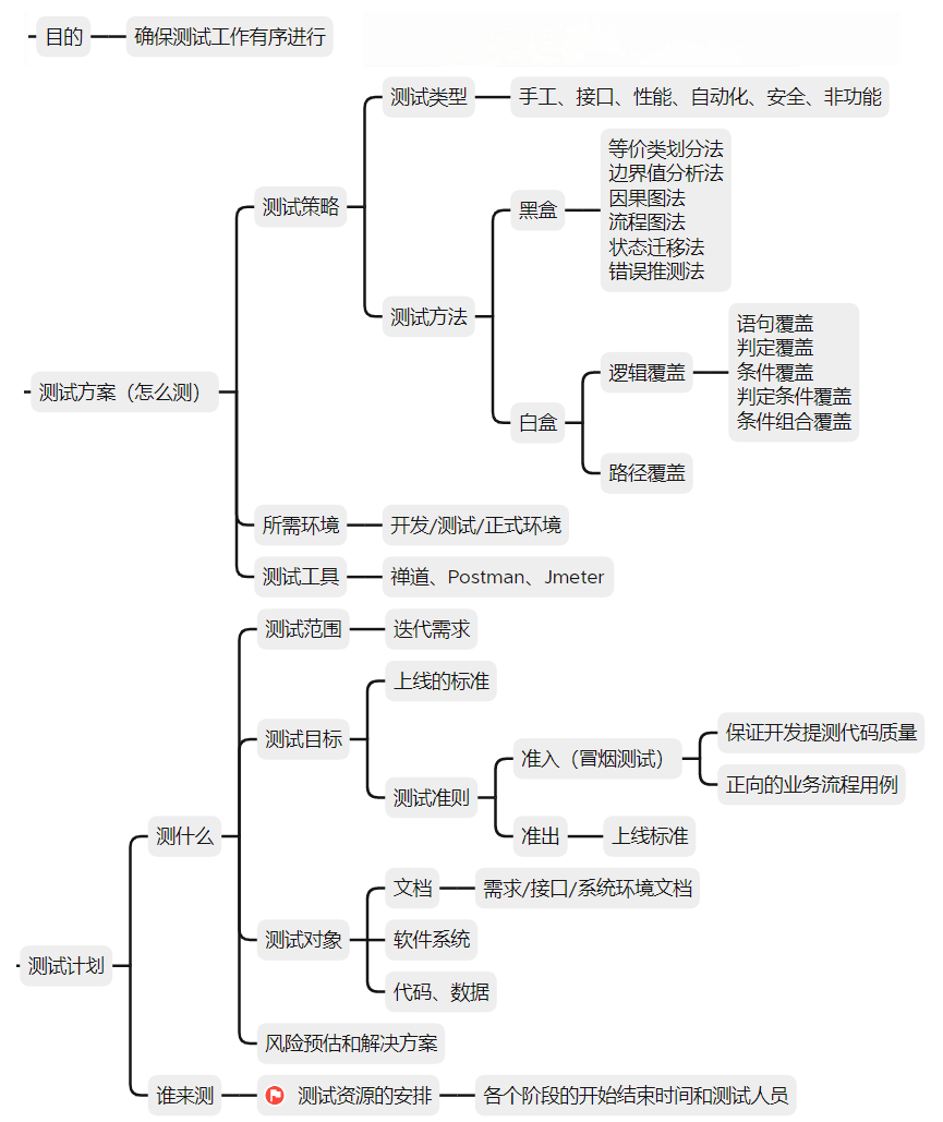 在我们的项目中测试计划主要涵盖:测试范围、测试资源、任务分配、阶段任务完成时间节点,偶尔会加上风险评估、测试环境等相关说明。