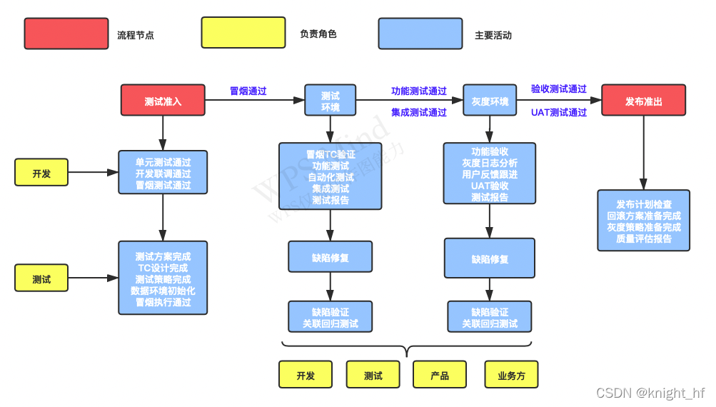 | 冒烟测试 | 对提测内容进行验证,是否满足约定的标准和内容 | 测试 | | 测试执行 | 测试执行过程非常关键,有各个环境的迭代执行,有不同测试类型的执行,有各个阶段的测试内容,有缺陷跟踪,方案测试等诸多内容 | 测试 | | 验收测试 | 项目是否满足业务预期功能,业务价值是否正确体现 | 测试、产品、业务方 | | UAT | 正式上线前,邀请业务方人员在灰度环境进行功能验收 | 测试、产品、业务方 | | 测试报告 | 测试过程和结果的总结和沉淀,包括测试计划和策略阶段的内容。也是发布准入的重要评估 | 测试 |