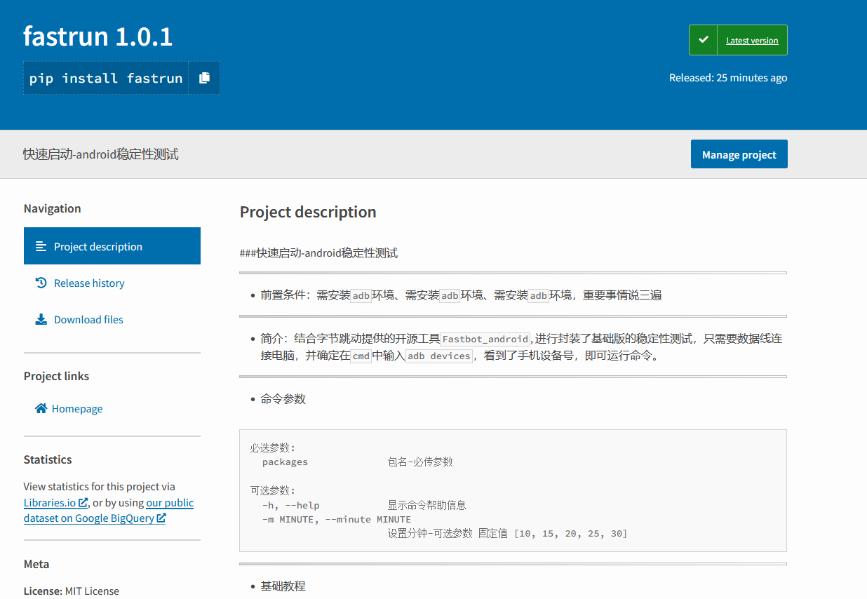 访问项目包地址 https://pypi.org/project/fastrun/