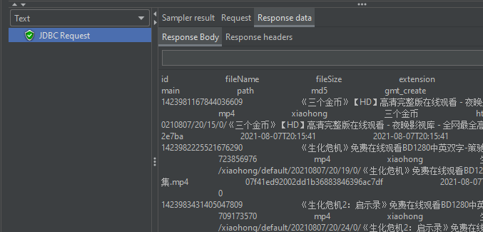 配完信息后就在回到jdbc请求的中间区域里填需要测试的sql语句即可  测试结果