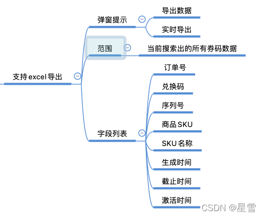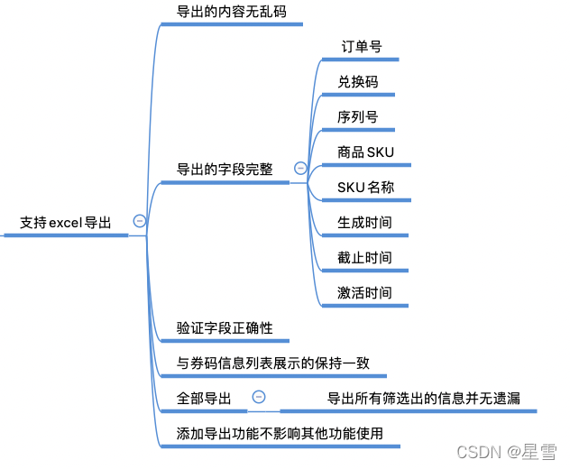 ?????????如图所示,这样去思考数据来源从哪些地方而来,放在用例设计的第一位,首先要想到的就是有无数据时怎么处理,这些页面的数据从哪里来的。 原则三:忌把用例当作垒需求????????我带过的几个实习生,让他们开始写用例的时候,第一版发给我看的时候,一眼看上去好多好多字,xmind上也好多好多行,外行人看起来觉得这个孩纸不错,很认真,需求也很全面,内行人一看,这哪是测试用例,这就是在写需求,把产品三句话写的需求写成三条用例,有的甚至还把需求文档的文字复制过来,这不叫测试用例,这叫垒需求。测试用例写的是一个个的测试点,测试点是一个个的场景,简单来讲就是你要在这个业务中测试哪些点。举个例子,我们来对比看下: ????????批量导出,需求文档是这么写的:可以导出当前搜索范围内的数据,支持实时导出excel格式的数据,导出的数据字段包括:订单号、兑换码......