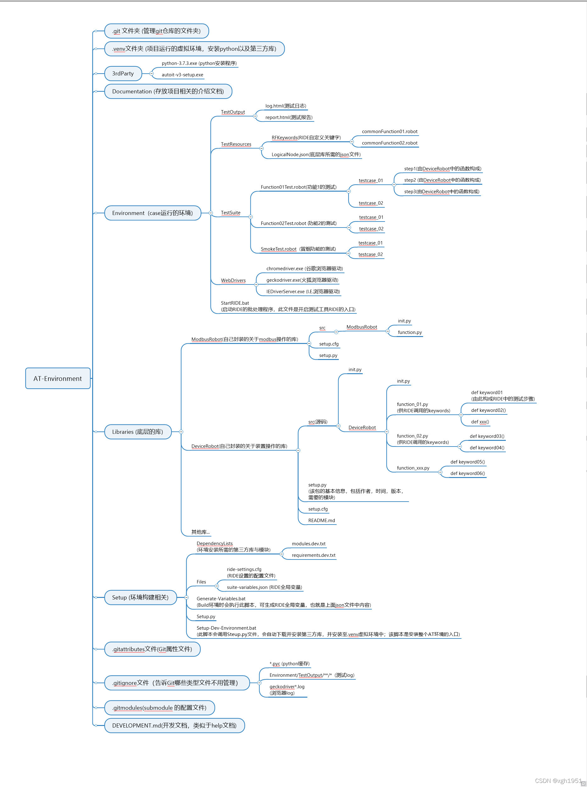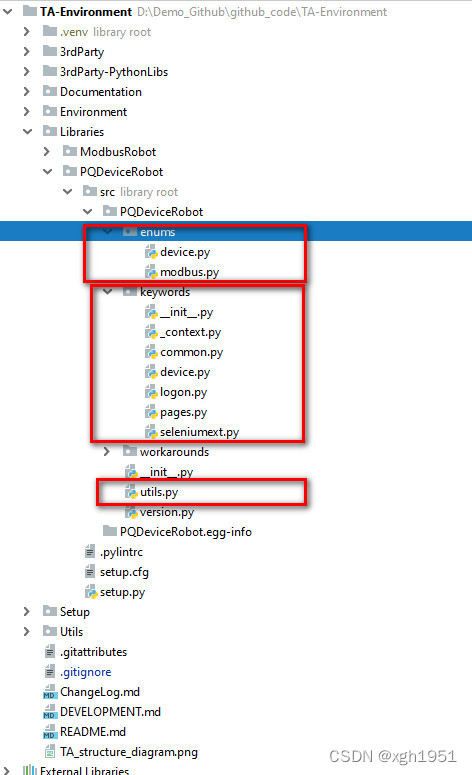 ?这个框架中主要有2部分比较重要:Evironment 和 Library,Environment中存放case相关的, Library中则存放底层的库。因为项目原因我删除了很多项目相关内容,目前框架中只剩下两个Library:ModbusRobot(工业用的Modbus相关的操作) 和DeviceRobot(具体项目的操作)