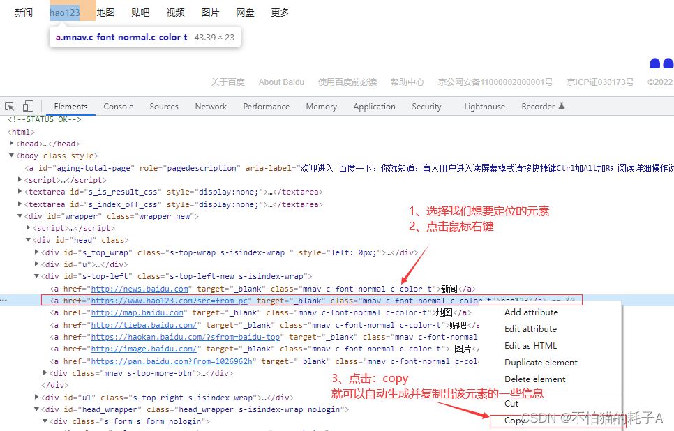 3、当然在实际中并不需要我们手动写一个元素的绝对路径,不然就太麻烦了。浏览器一般是提供了获取元素绝对路径等信息的方法 ?? ?⑴这里以谷歌浏览器为例:选中想到定位的元素->鼠标右键->copy->选择复制所需该元素信息(复制的值是啥,我们就用啥) ?? ?⑵copy Xpath:复制该元素的Xpath路径(相对路径) ?? ?⑶copy full Xpath:复制该元素的Xpath路径(绝对路径) ?? ?⑷copy selector:复制该元素的CSS选择器