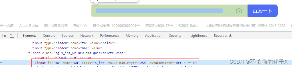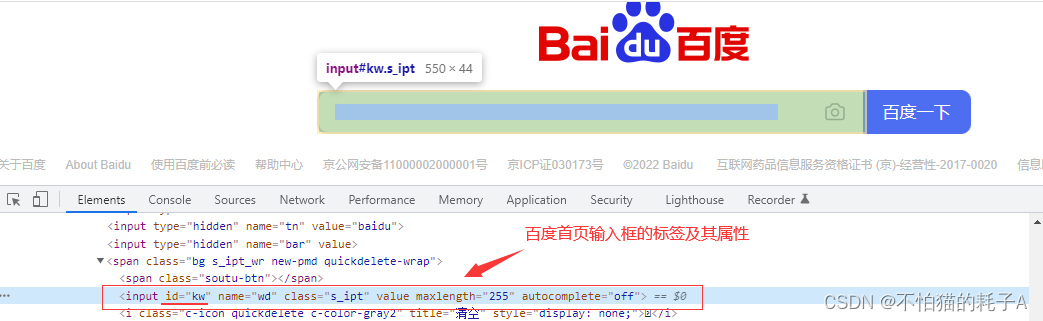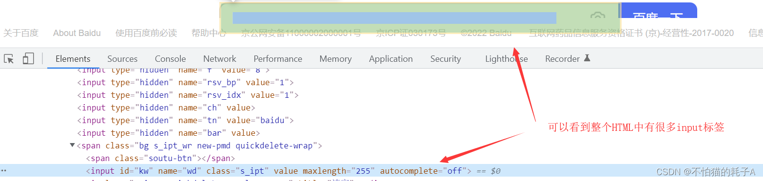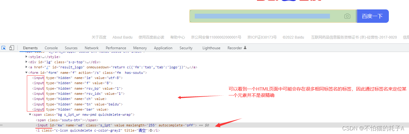 1、HTML的本质就是通过tag(标签)来定义实现不同的功能,每一个元素本质上也是一个tag,由于一个tag往往代表某一类功能,因此通过tag名(标签名)来定位某个元素的概率很低 ?? ?⑴打开任意网页,查看其HTML就会发现有大量的<div>、<input>、<a>等标签,所以很难通过标签名(tag name)去区分不同的元素