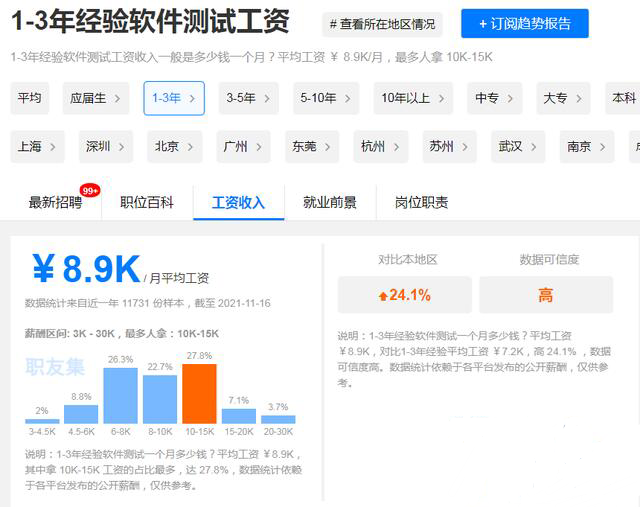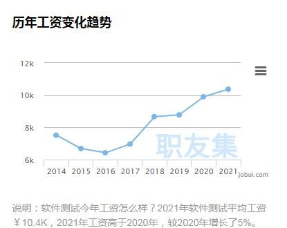 从地区薪资统计可以看出,**一线城市的薪资待遇基本上都在10k以上,**相比于其他二三线城市来说,薪资待遇明显偏高;从图上可以看出,软件测试的薪资待遇整体上还是非常不错的,从2016年至今,软件测试的薪资待遇一直处于增长趋势。   从相关数据图可以看出,软件测试的薪资待遇和从业年限和个人基本条件也是有关系的,暴龙总结出以下两点:    **从业年限越长,经验越丰富,薪资就越高;**同等条件下,本科学历要比专科学历薪资高一些,但也不是决定性因素;最后决定薪资待遇的因素就是技能掌握程度,技能掌握越全面则薪资待遇越高,一般来说测试开发工程师的薪资待遇是行业内最高的,功能测试的薪资待遇相对来说就会低一些,所以要想长期在这行发展的伙伴,还是要持续学习,不断提升技术水平。