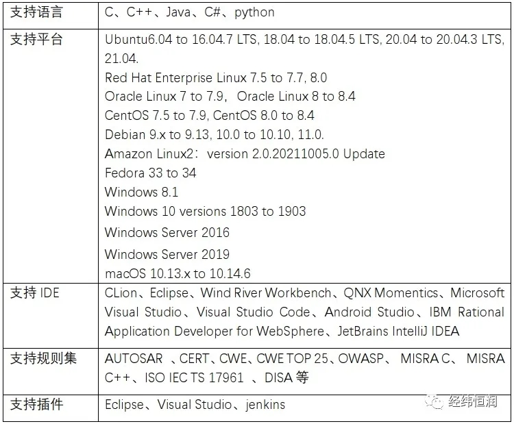 - 能够支持多种编程标准(如MISRA C:2012、OWASP、CWE、CERT C、AUTOSAR