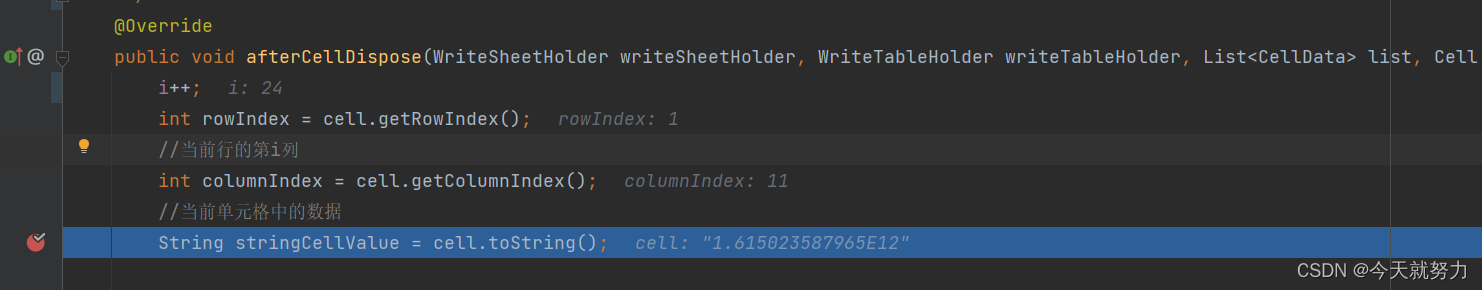 ? ? ? 注意:afterCellDispose方法中千万不能写查询数据库的逻辑,有因为你要往excel中写入多少数据他会调用几次这个方法,下面的i变量是我计次用的.