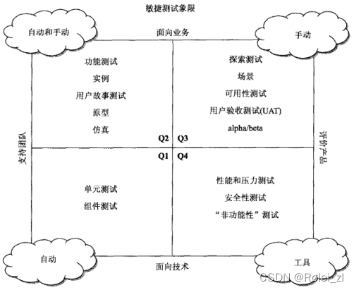 如何把质量构建到代码中,人是促使项目成功的关键 把质量构建进产品中而不是在生产出来之后再进行测试 测试人员的主要活动是测试和保证质量的人 以团队方式面对问题、解决问题,共同决定如何更好的改进产品 敏捷测试,面向业务/客户的测试,提供驱动编程,从客户利益角度出发保证质量,协助开发交付最大业务价值 合作的目标,团队中的所有参与者一起,为组织创造价值 快速反馈,驱动项目前进,整体团队运作,关心发布优秀产品所需的技能和资源 快速的从客户得到反馈,快速的从组织内得到反馈,快速的从测试得到已完成产品的质量反馈 创造力、接受新思想、乐于承担不同任务与角色,重视客户,技续关注全局 在较低版本提供客户目前最迫切需要的功能,发布最需要的功能,然后再完善,尽可能做最简单、最有用的事 --?尽可能早的体现产品价值 集中关注一两个问题,以确保彻底解决实际问题,获取更好的投资回报 避免质量警察思想:认为测试可以对质量负责 团队中的每个成员有同等的价值 敏捷:重量级文档 ->?轻量级文档,以一种合适的方式呈现给需要的人(按需要者所需要的格式书写);需要的文档:时时更新、阶段更新,而非最后统一做文档 能从数据中得到什么:不要过多的关注个人度量,而要着眼全局,着眼于目标和达到目标的趋势,关眼于度量的投资回报率 --?确认度量目标 缺陷的作用:协助开发、运维快速的查找和定位问题 --?因此是否记录,如何记录并不是关键,关键是解决问题,只有未能解决的问题才被记录,而不是将问题作为测试人员的绝以度量指标 敏捷象限:驱动开发的面向技术和面向业务的测试 帮助客户发现和描述预期系统行为,帮助客户获取和沟通所有与故事或主题有关的需求,注意:当迭代中不包含某个故事时,不要过多的涉及细节,因为变化时刻存在 面向业务测试的目的是促进客户和开发人员之间的沟通和协作,确保团队在每一次迭代中都产生真正的价值 认真思考来驱动非预期方向的测试并发现错误 --?软件的价值在于修得客户的痛点,找到痛点的可能是客户,更多的是软件服务提供方,如何平衡? 从客户角度看,应当交付什么产品(不要提供许多并不需要的额外信息);提出问题以发现客户希望的真正的业务价值,同时管理客户期望? 全面考虑所有功能及其影响,需要对系统或产品有完整的认识 新的领域知识或新技术意味着陡峭的学习曲线 坚持不懈的跟踪开发过程,制定合适的计划阻止“不成功”状态的出现 敏捷:适应价值的世界的一种收获,快速的产生价值以帮助业务增长和成功