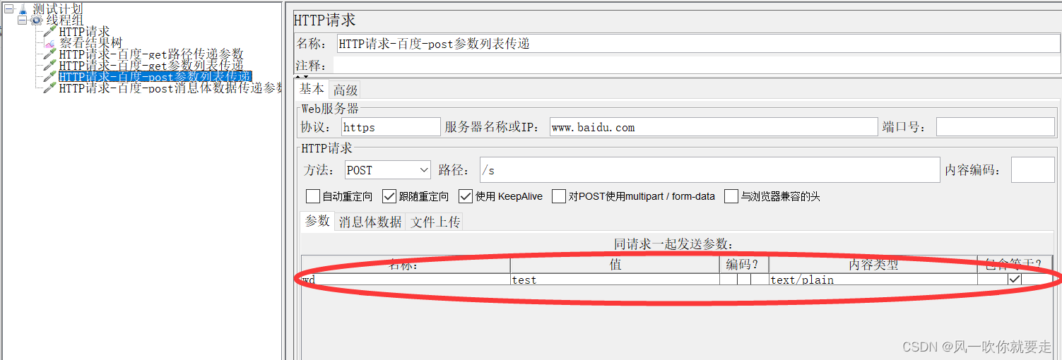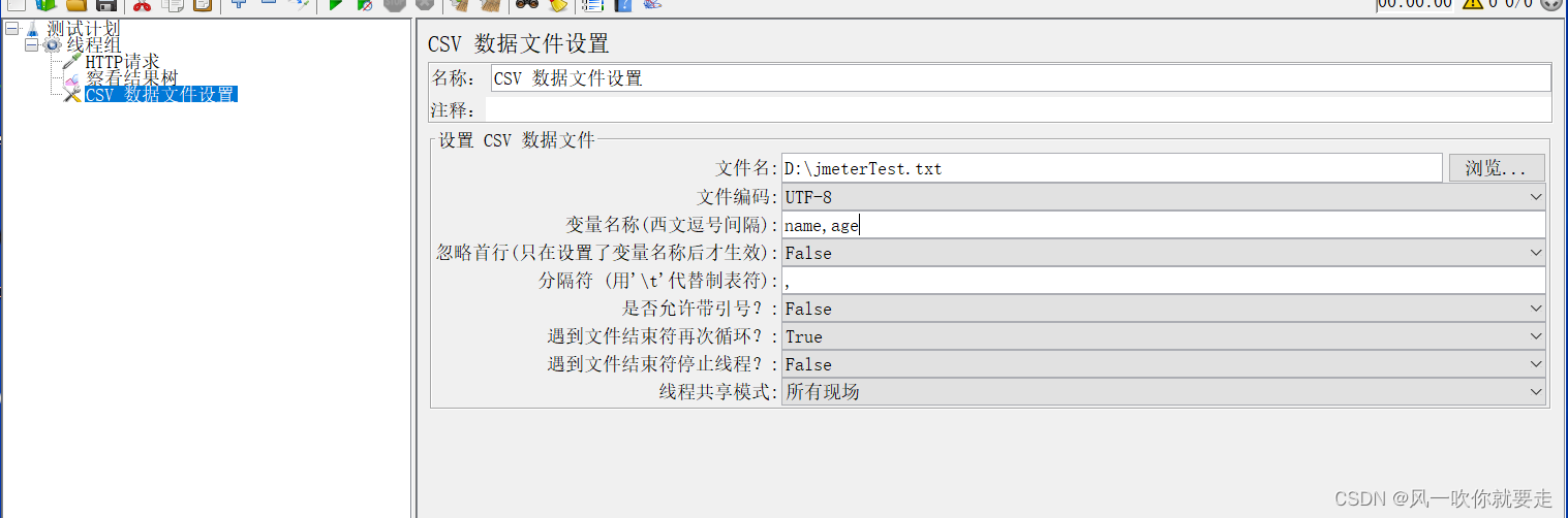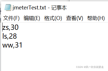 需要导入外部一个含数据的文件,这里给定的是jmeterTest.txt