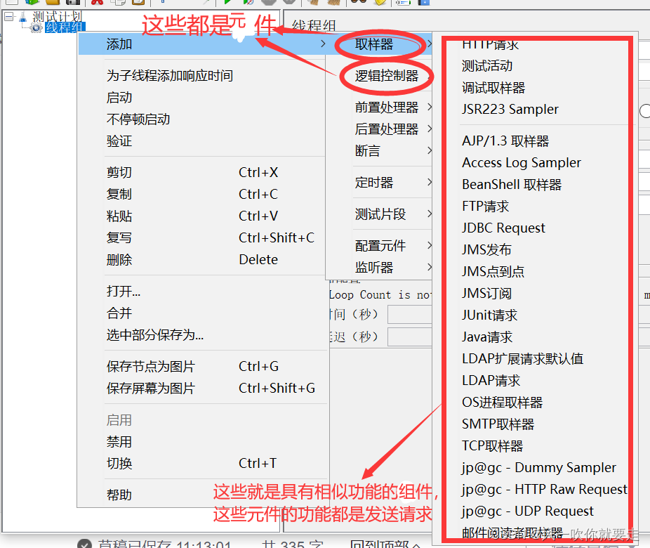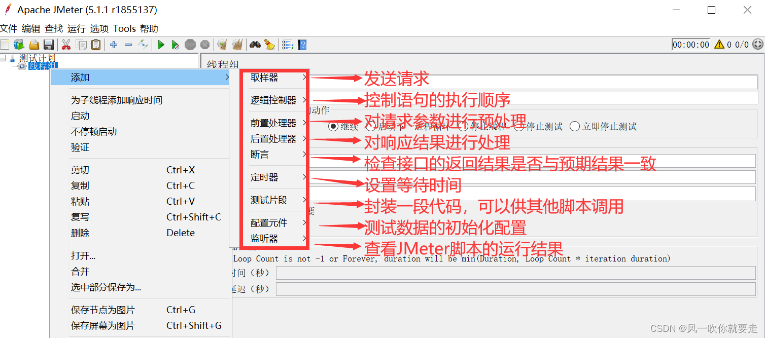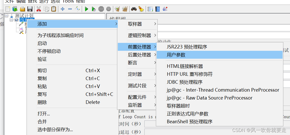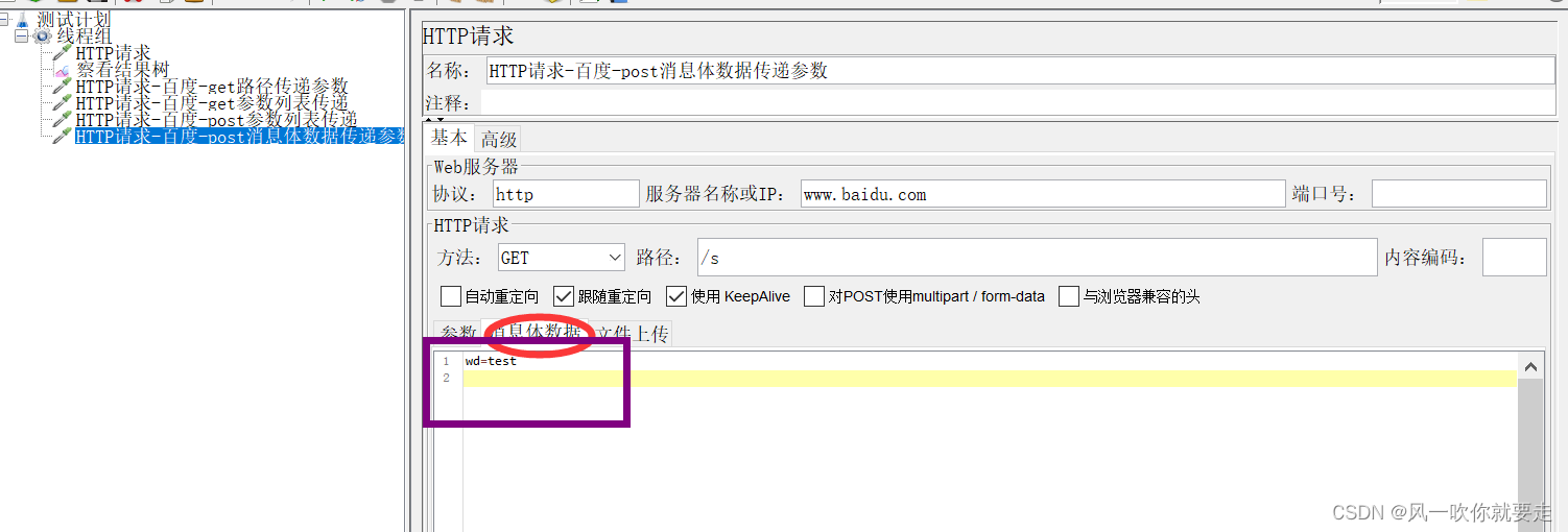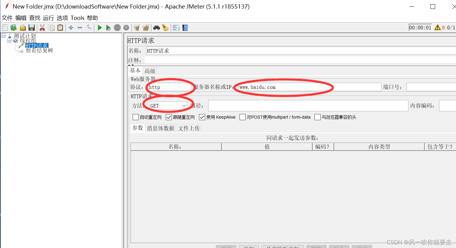 ?②在线程组上右击选择一个HTTP请求 和一个察看结果树