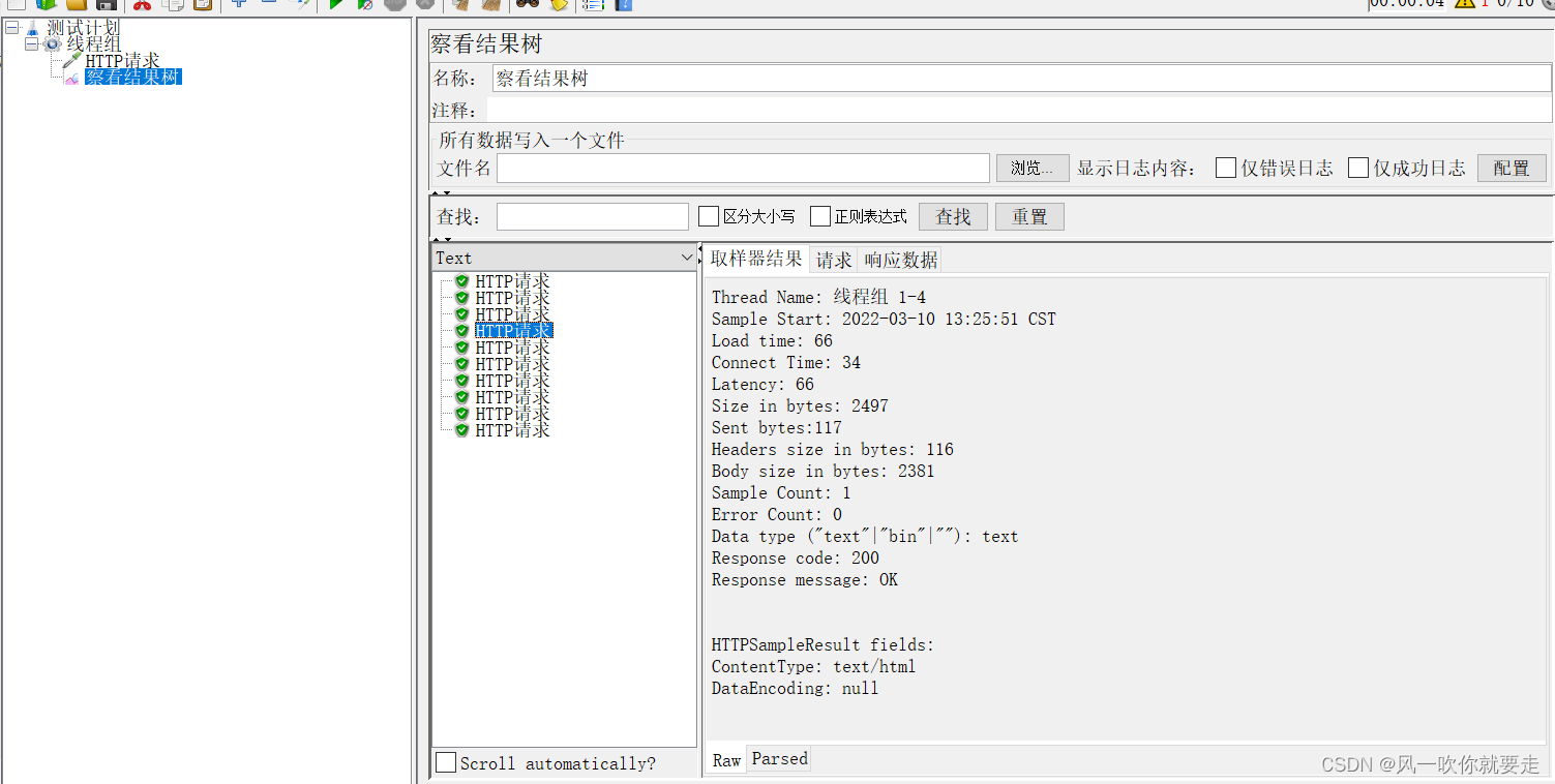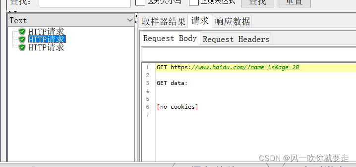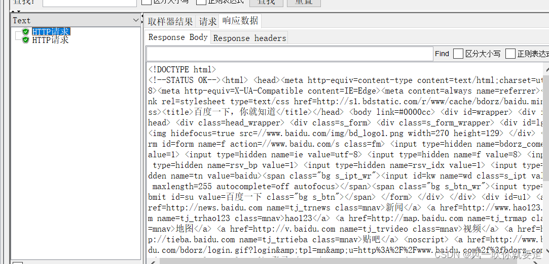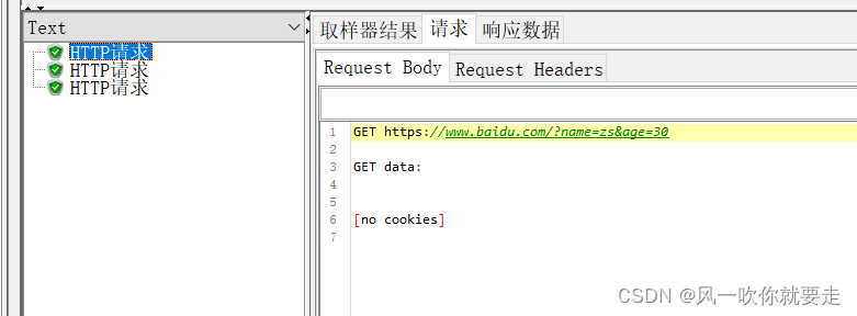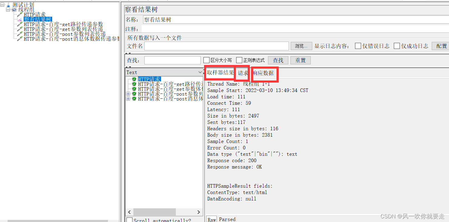 结果树中有三部分,取样器结果,请求(请求头,请求体),响应数据(响应头,响应体)。