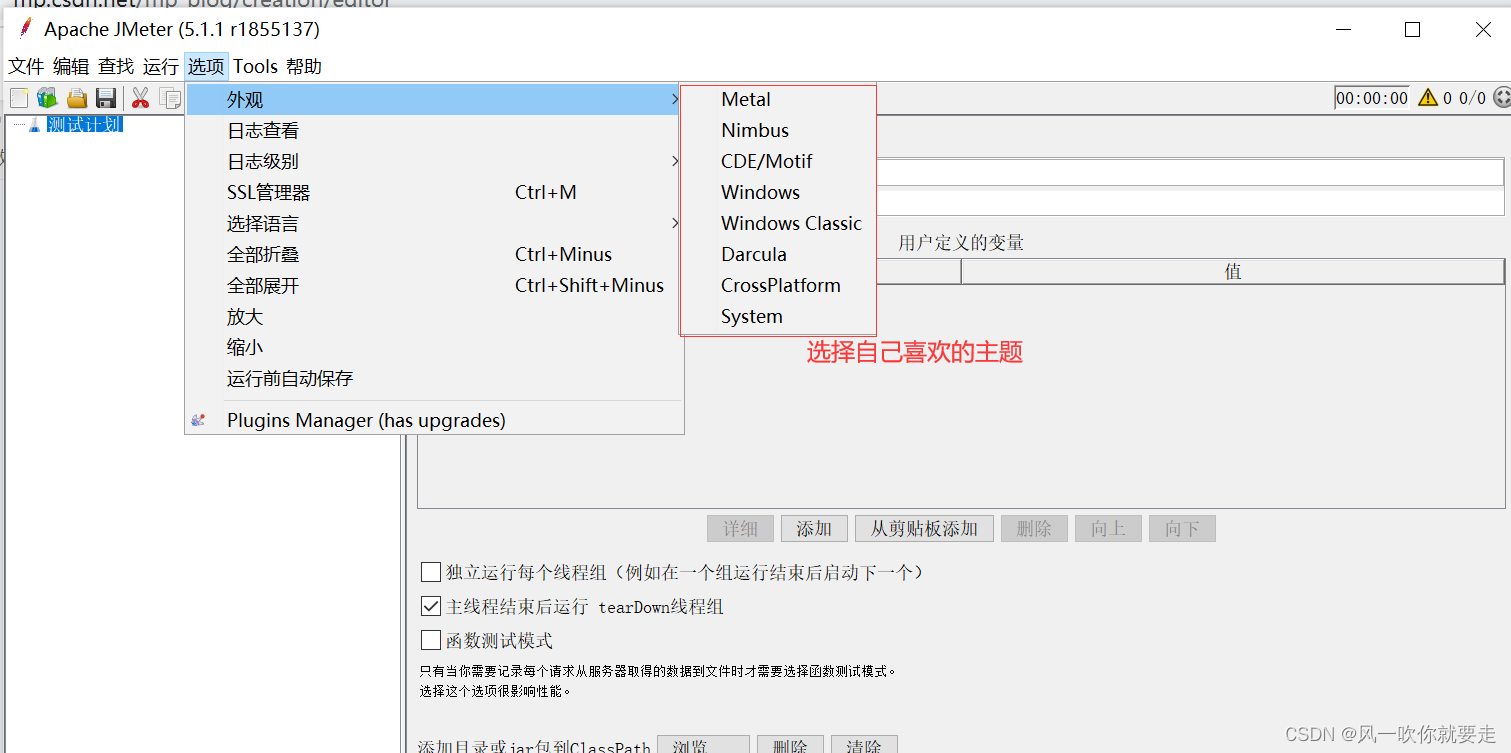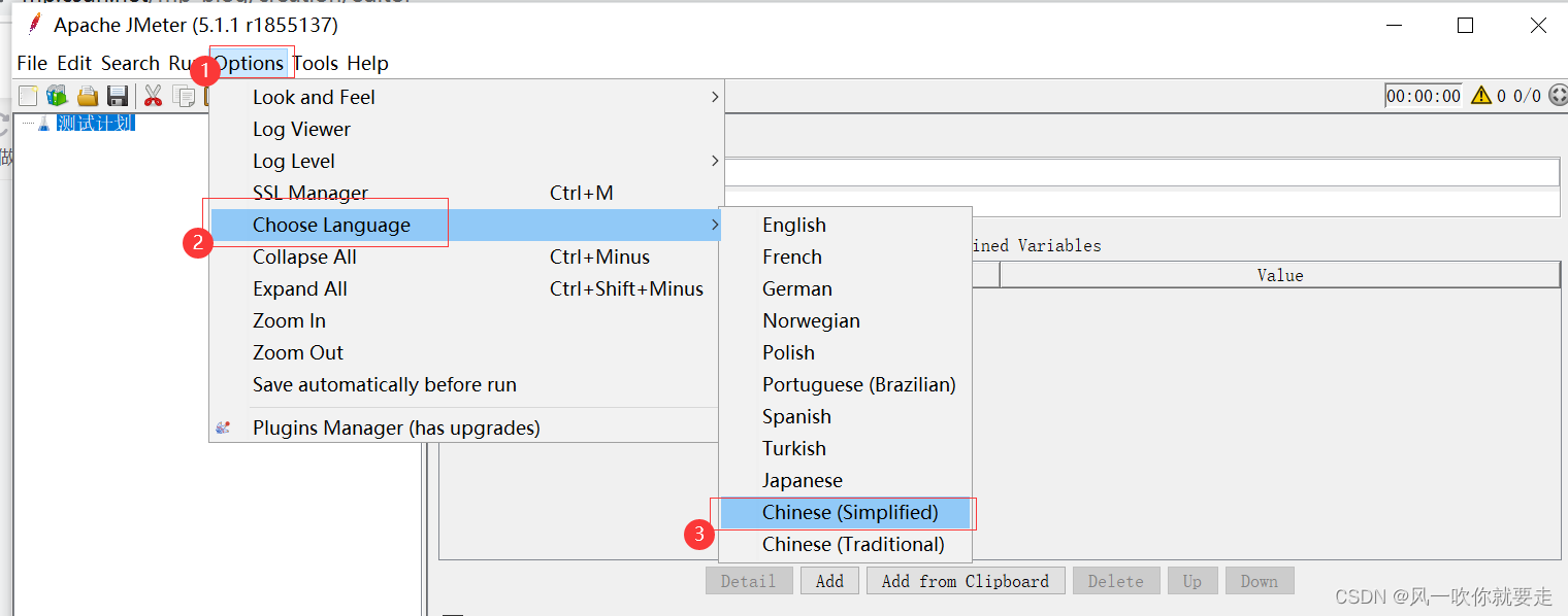 ①临时性修改:启动JMeter,选择菜单栏中的Options,选择Choose Language 选择chinese。(每次启动都需要修改,不推荐)