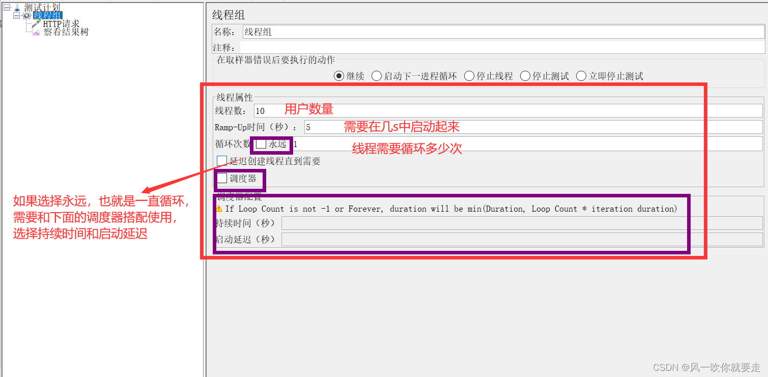可以通过设置线程组中的线程数、循环次数等,来实现一个或者多个用户发送一个或者多个请求。