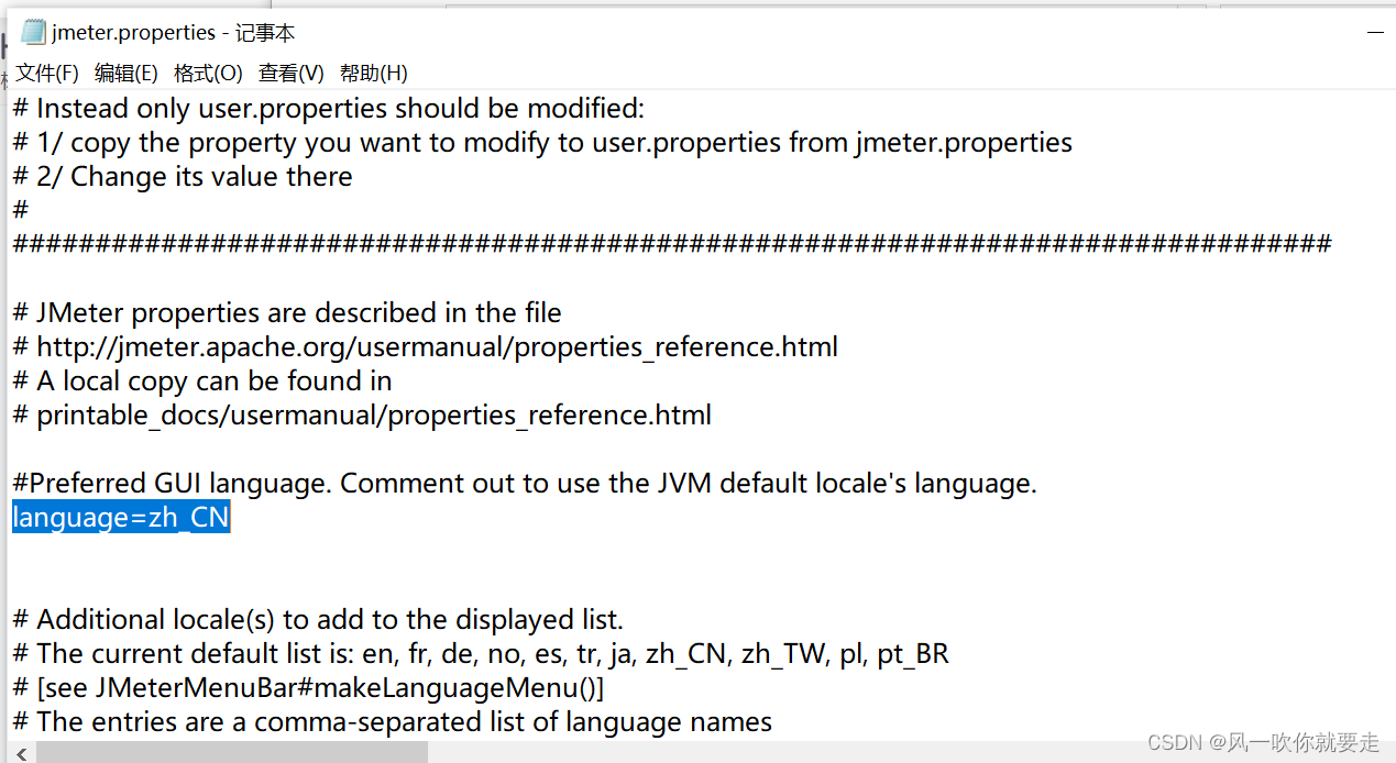 ②永久性修改:修改配置文件bin目录下得jmeter.properties文件,找到文件中的#language=en,将其修改成language=zh_CN(注意删掉前面的#),重启JMeter。