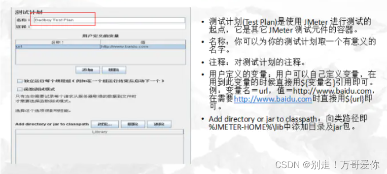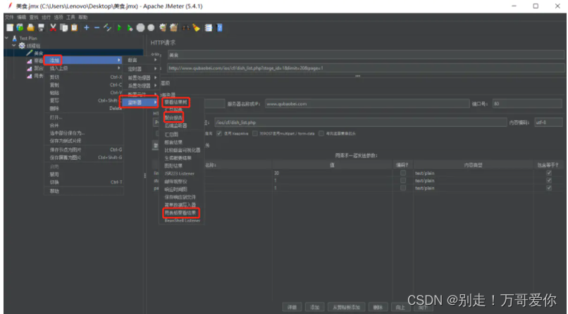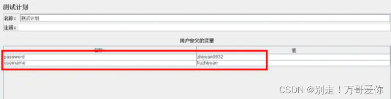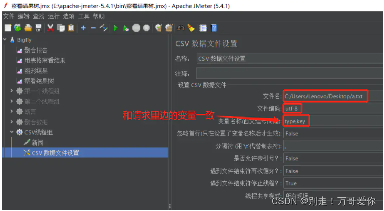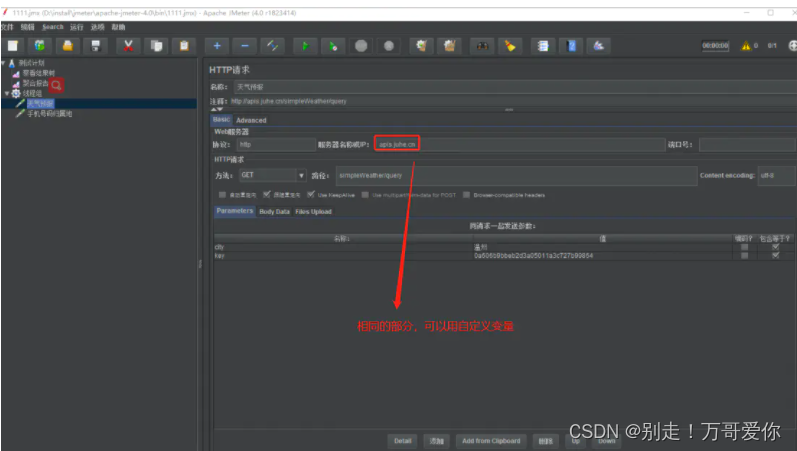 Filename:所需数据文件的路径。如和脚本同一路径,可直接填写文件名 File encoding:编码和文件保持一致即可,默认为ANSI。如有中文,建议为UTF-8 Variable Names:引用变量时的变量名,对应数据文件中的每一列,以逗号分隔。如不填写,文件的第一行数据将被读取为变量名 Delimiter:在.txt、.dat文件中,可以用逗号(,)或者Tab键(\t)来区分列与列 Allow quote data:选项选为“true”的时候对全角字符的处理出现乱码 Recycle on EOF:到数据文件结尾时是否循环读取。设置为True时,线程数过多,数据文件读取到最后一行时,会再次从第一行开始读取。设置为False,到达文件结尾时如继续读取,则值会默认为<EOF>,可通过设置jmeter属性csvdataset.eofstring来改变该值。 Stop thread on EOF:Recycle on EOF设置为False,Stop thread on EOF设置为True,则读取数据文件最后一行后,停止测试,不管还有多少线程组未执行。 Sharing mode:共享模式。默认在所有线程组中使用,可选择每个线程组单独打开 相同的部分使用用户自定义变量 只需要修改一次接口 效果展示